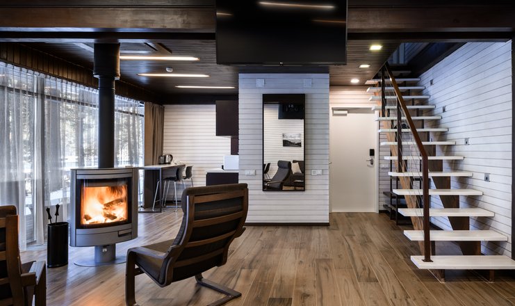 В номере: вешалка: кронштейн для одежды, диван, зеркало, кресла, кровать двуспальная, прикроватные тумбочки, стол, стол для компьютера, столик журнальный, стулья, гладильная доска, духовой шкаф, кофемашина, микроволновая печь, набор посуды, плита электрическая, телевизор ЖК, телефон, утюг, холодильник, электрочайник