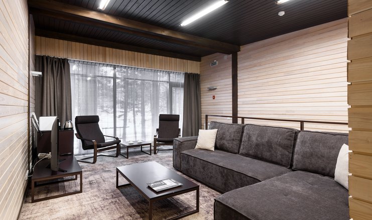 В номере: вешалка: кронштейн для одежды, диван, зеркало, кресло, кровать двуспальная, обувная полка, прикроватные тумбочки, столик журнальный, стулья, кофемашина, мини-холодильник, набор посуды, сейф, телевизор ЖК, телефон, электрочайник