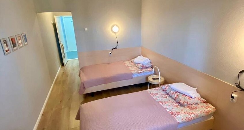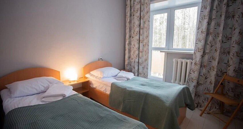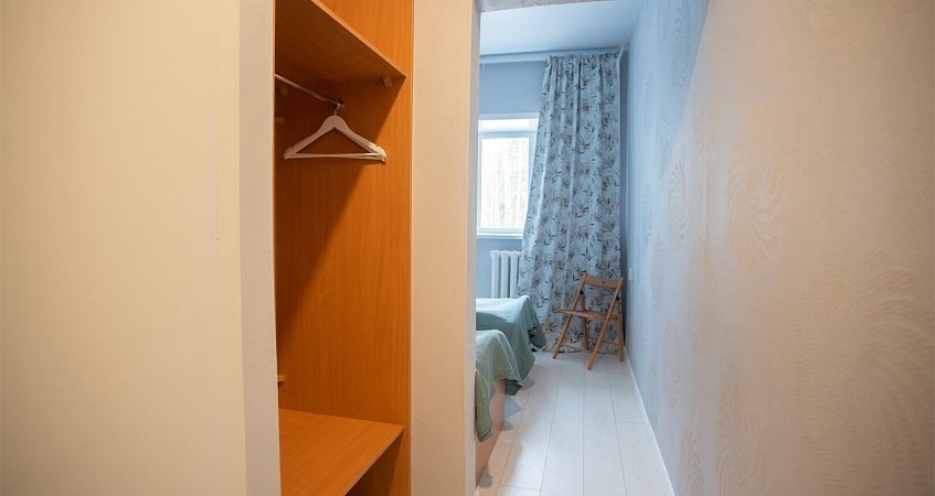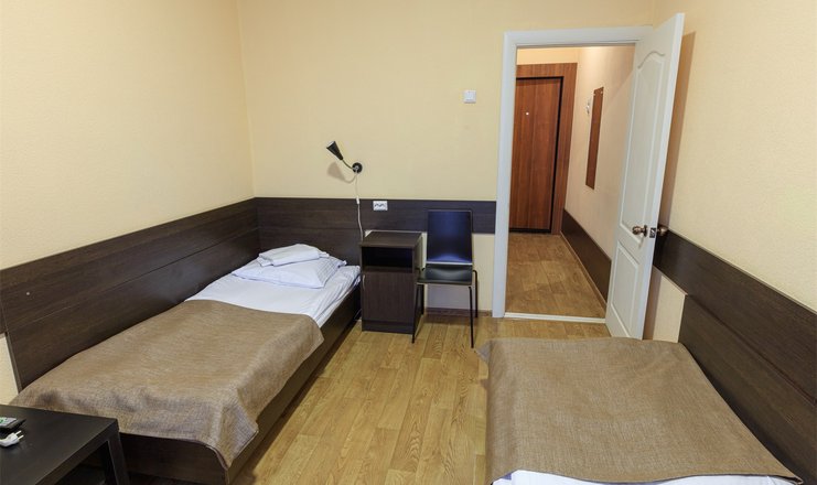 Оснащение номера: Вешалка, зеркало кровати односпальные,прикроватные тумбочки, стол, стулья, шкаф