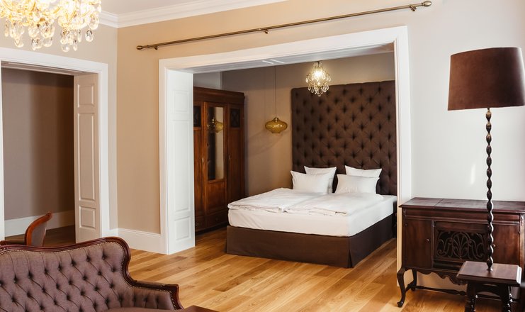 В номере: комод, кровать двуспальная, набор мягкой мебели, прикроватные тумбочки, стол, столик журнальный, шкаф, шкаф для посуды, кондиционер, кофемашина, сейф, телевизор ЖК: спутниковое ТВ