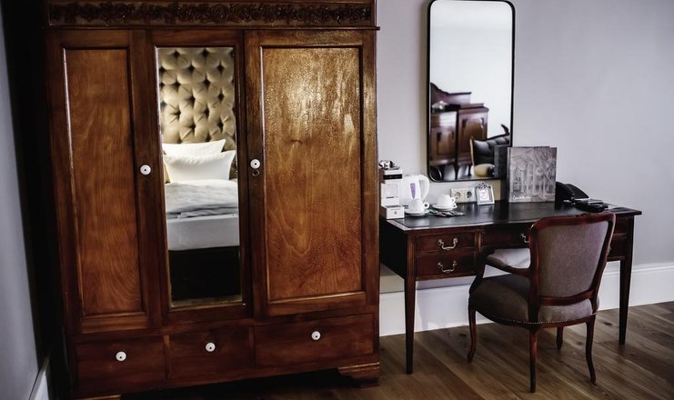 В номере: вешалка, зеркало, комод, кровать двуспальная, набор мягкой мебели, прикроватные тумбочки, стол, столик журнальный, столик туалетный, стулья, шкаф, кондиционер, кофемашина, сейф, телевизор ЖК, телефон