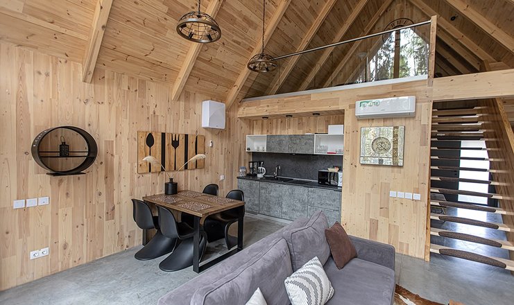 В номере: диван раскладной, зеркало, кровать двуспальная, кухонная мебель, прикроватные тумбочки, стол, стулья, шкаф, гладильная доска, кондиционер, мини-холодильник, набор посуды, плита электрическая, телевизор ЖК, утюг, электрочайник