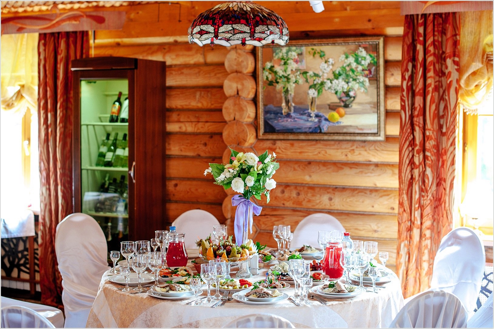 Свадьба может быть устроена как в ресторанах отеля, или Каминном зале, так и на улице в специально установленных шатрах — все зависит от времени года и пожеланий молодоженов. Интерьер ресторана «Буффет» выполнен в традиционном славянском стиле. Здесь каждый чувствует себя, как дома – спокойно и уютно, атмосфера располагает к приятным беседам.