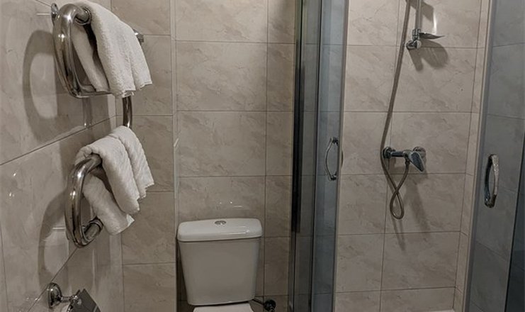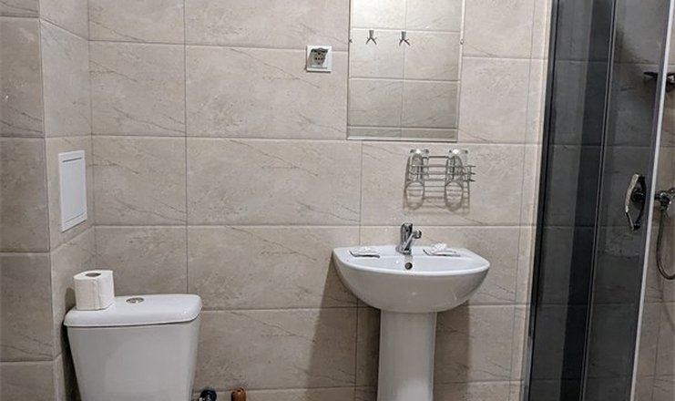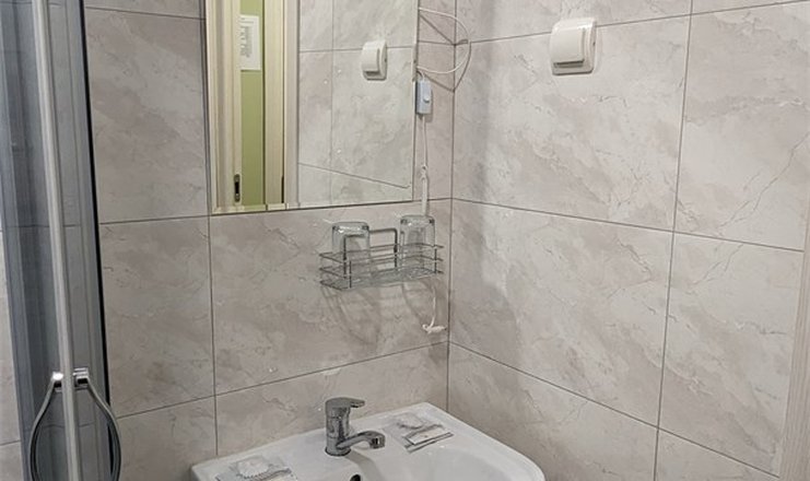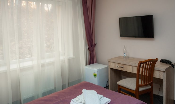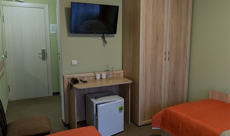 В номере: вешалка, зеркало, кровати односпальные: 2, стол, стул, шкаф, мини-холодильник, телевизор ЖК, телефон, чайный набор посуды