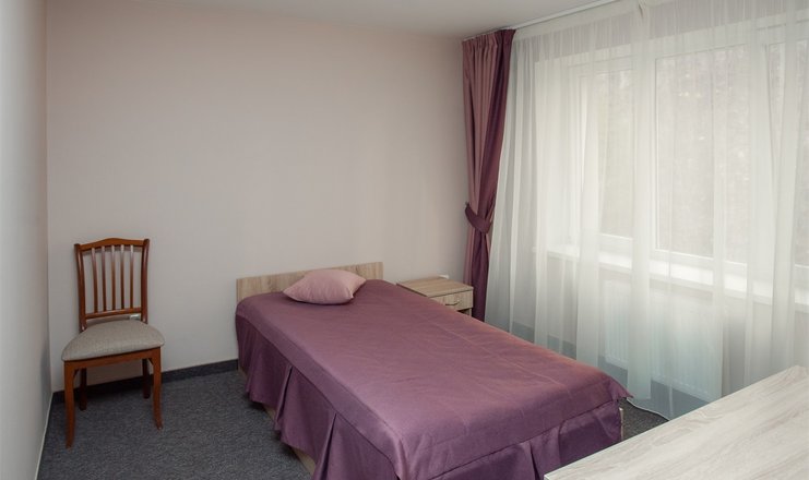 В номере: гардеробная, зеркало, кровать односпальная, стол, стул, тумба, шкаф, мини-холодильник, телевизор ЖК, телефон, чайный набор посуды