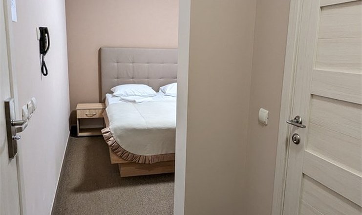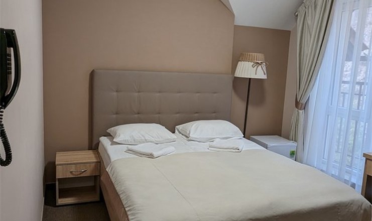 В номере: вешалка, зеркало, кровать двуспальная, стол, стул, шкаф, мини-холодильник, телевизор ЖК, телефон, чайный набор посуды