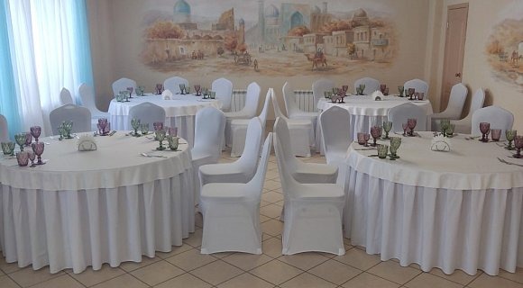 Этот светлый просторный зал с ручной росписью идеально подойдет для проведения свадебного торжества, дня рождения или юбилея
