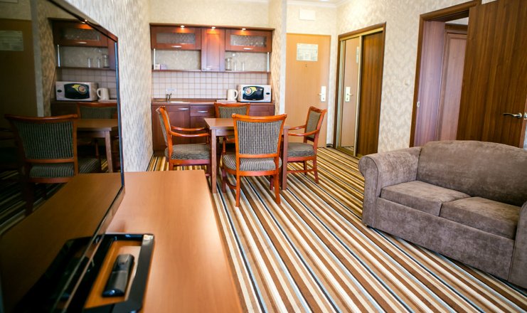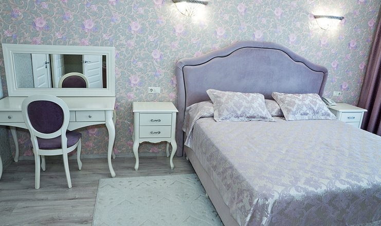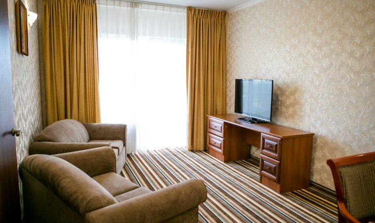 В номере: вешалка, диван, зеркало, кровать двуспальная, диван-кровать на доп. место, прикроватные тумбочки, стол, стулья, шкаф, гладильная доска, микроволновая печь, мини-холодильник, набор посуды, сплит-система, телевизор, телефон, утюг, электрочайник
