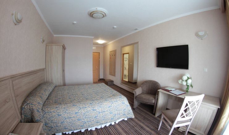 В номере: вешалка, зеркало, кровать двуспальная, раскладушка  на доп. место, прикроватные тумбочки, стол, стулья, шкаф, мини-холодильник, сплит-система, телевизор, телефон, чайный набор посуды, электрочайник