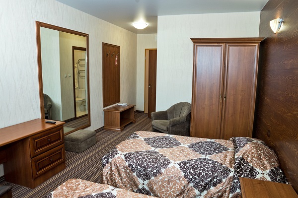 В номере: вешалка, зеркало, кровати односпальные, раскладушка  на доп. место, прикроватные тумбочки, стол, стулья, шкаф, мини-холодильник, сплит-система, телевизор, телефон, чайный набор посуды, электрочайник