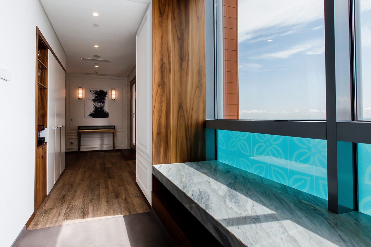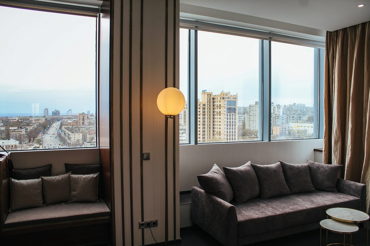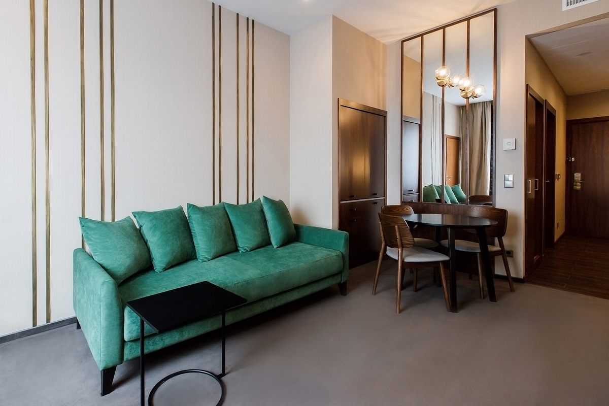В номере: две комнаты: спальня и гостиная, двуспальная кровать, прикроватные тумбы, стул, шкаф, набор мягкой мебели, столик журнальный, кофемашина, мини-холодильник, сейф, телевизор ЖК, телефон, чайный набор посуды, электрочайник