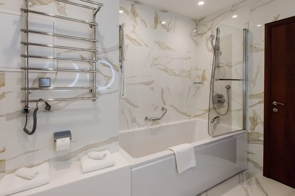 Санузел: ванна, раковина, унитаз, тапочки, туалетные принадлежности, фен