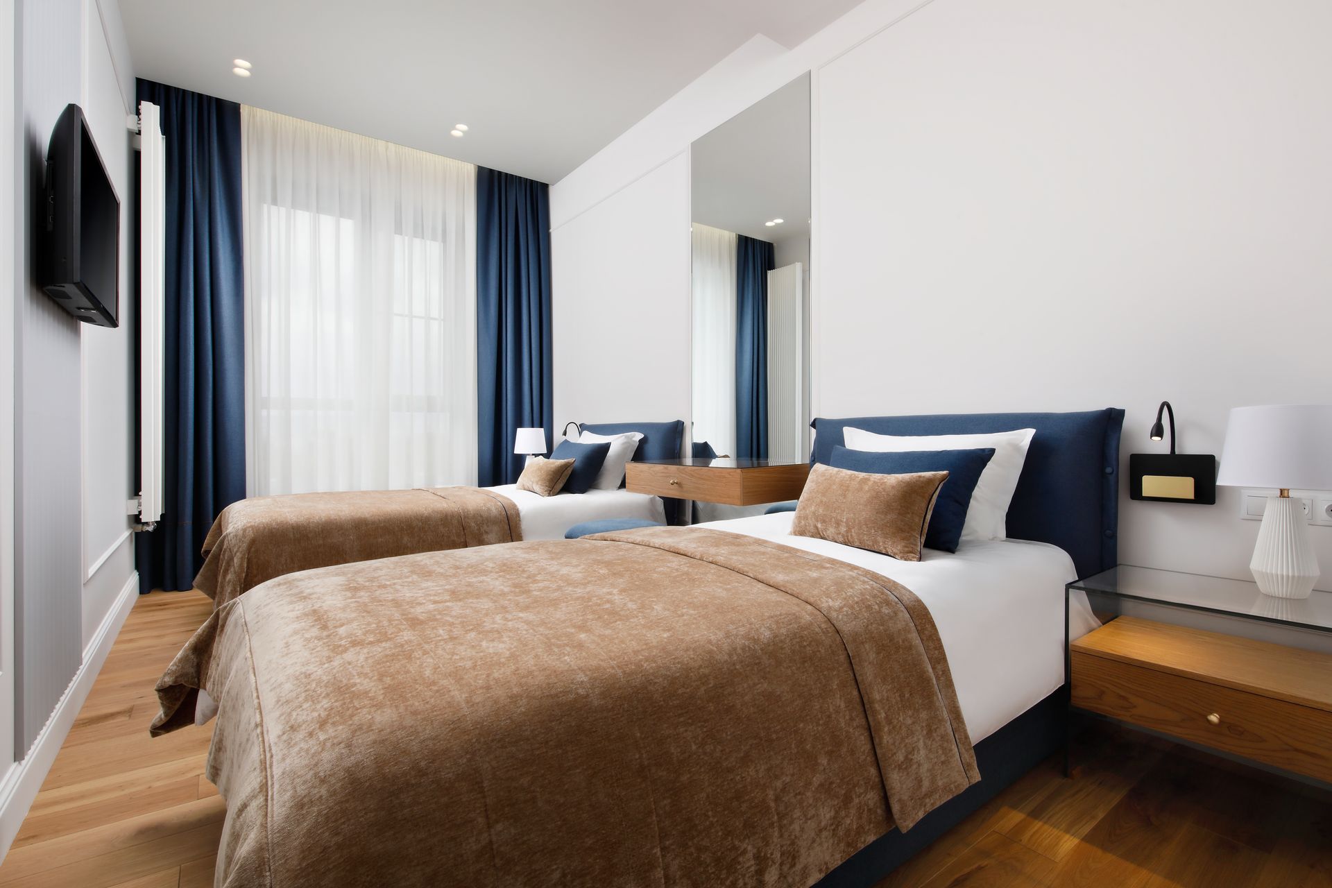 В номере: две спальни и гостиная, двуспальная кровать, две полутораспальные кровати, прикроватные тумбы, стол, стулья, шкаф, диван, кондиционер, кофемашина, сейф, телевизор (два), телефон, холодильник, чайный набор посуды