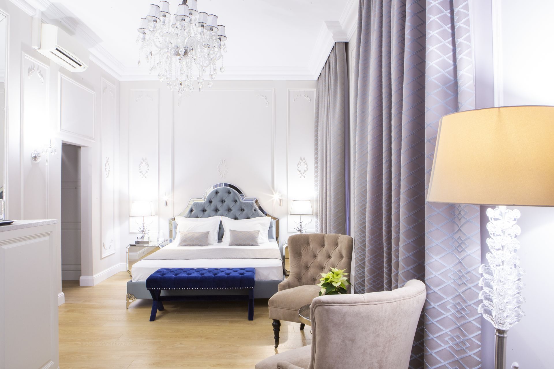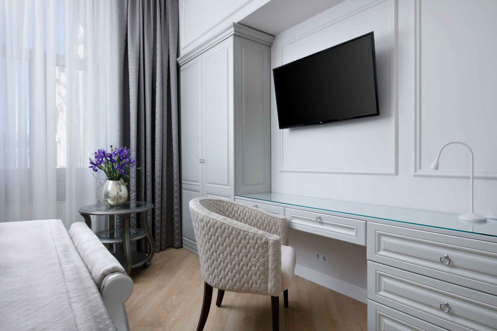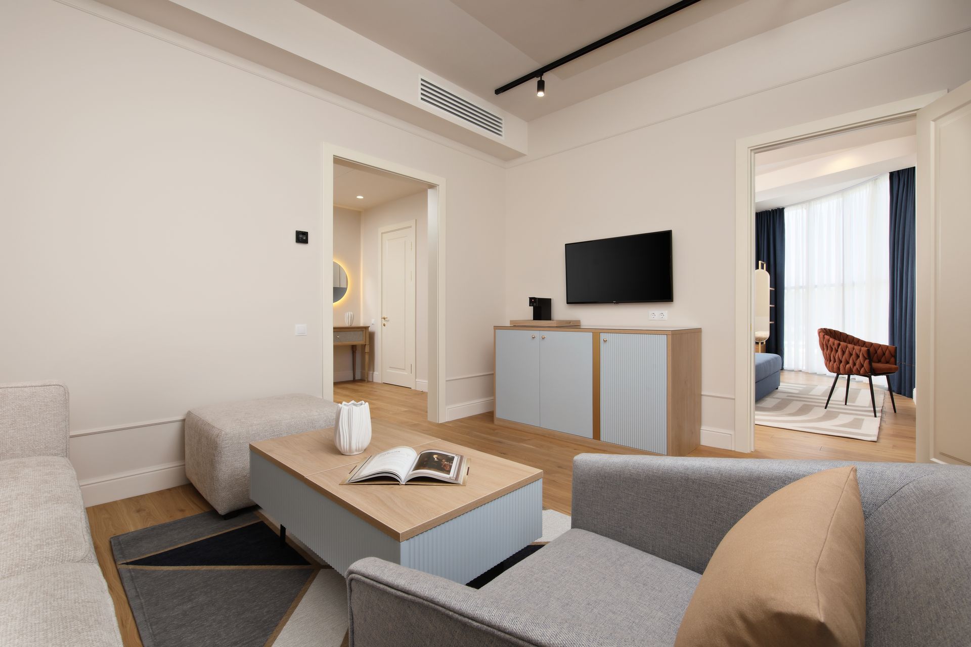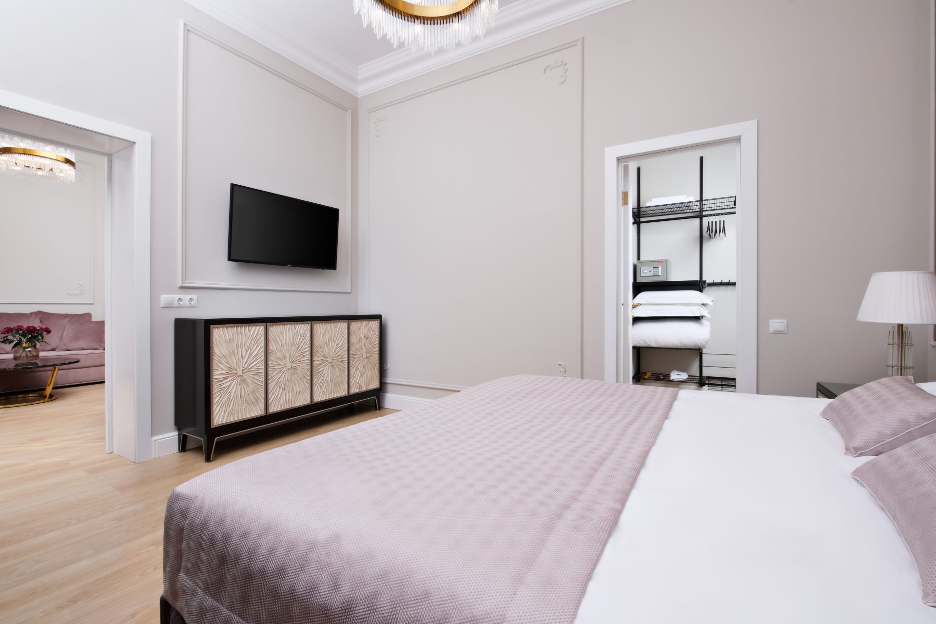 В номере: спальня и гостиная, двуспальная кровать, прикроватные тумбы, стол, стулья, шкаф, диван, кондиционер, кофемашина, сейф, телевизор, телефон, холодильник, чайный набор посуды