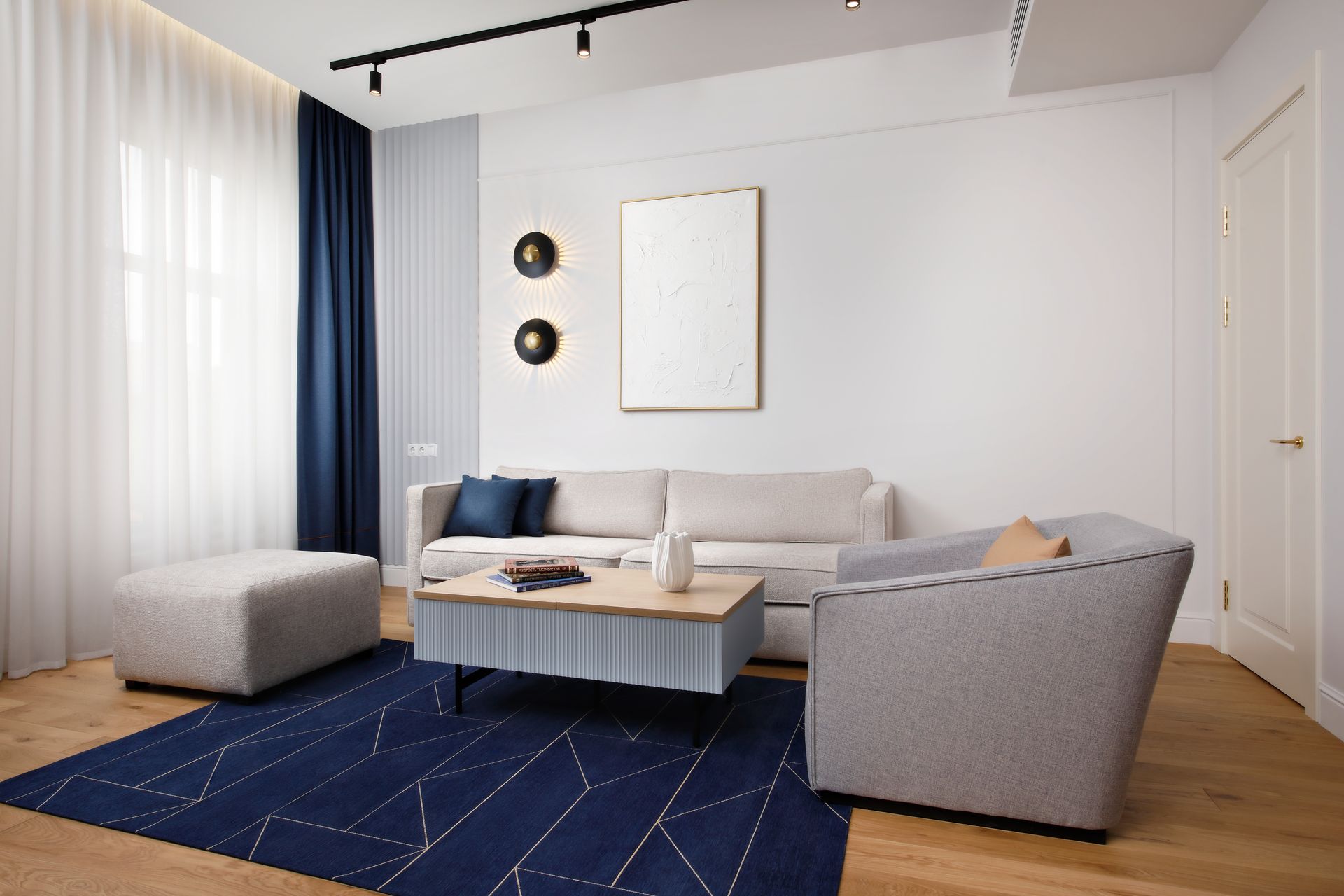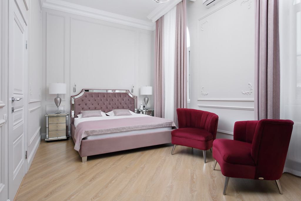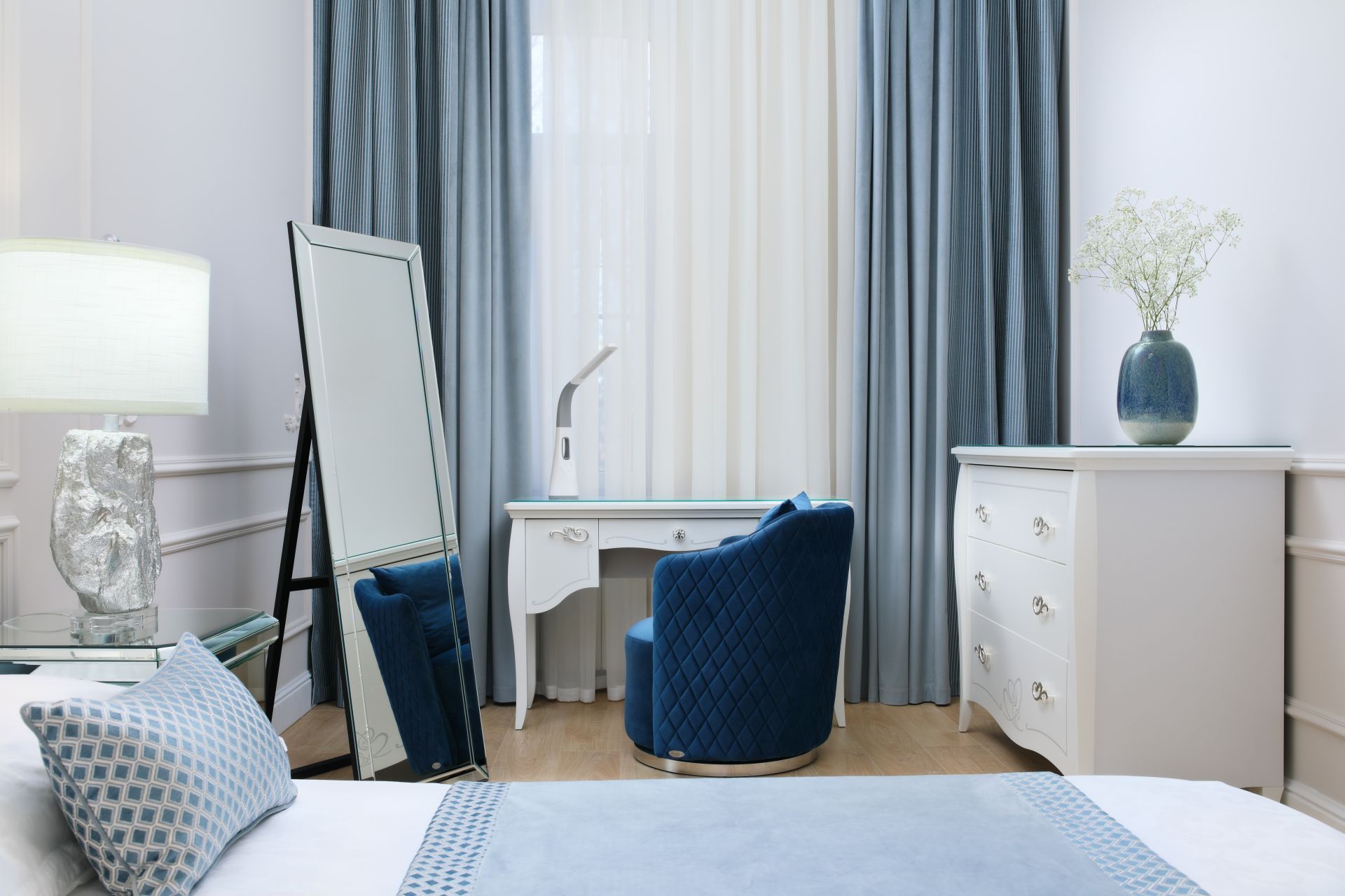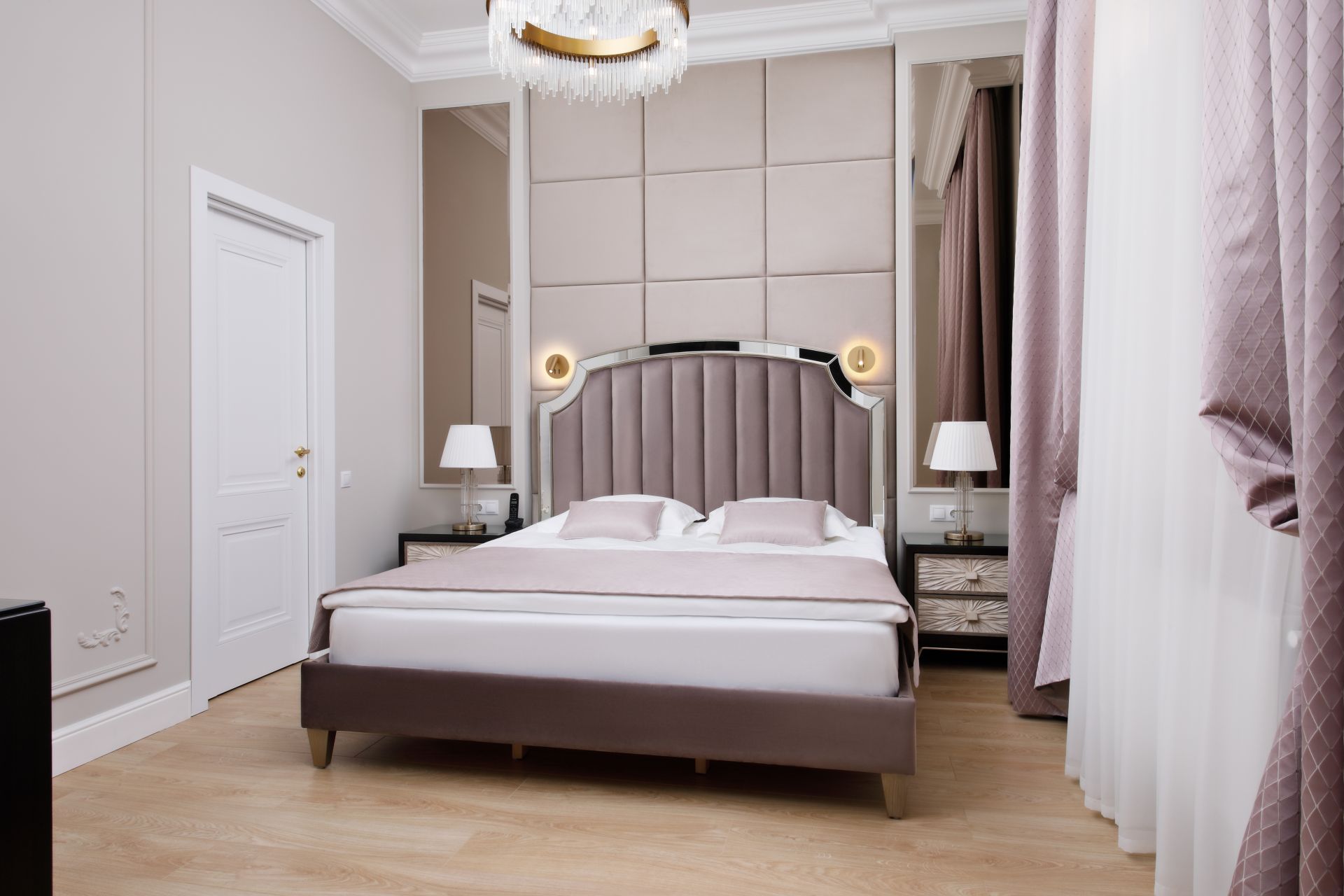 В номере: спальня и гостиная, двуспальная кровать, прикроватные тумбы, стол, стулья, шкаф, диван, кондиционер, кофемашина, сейф, телевизор, телефон, холодильник, чайный набор посуды