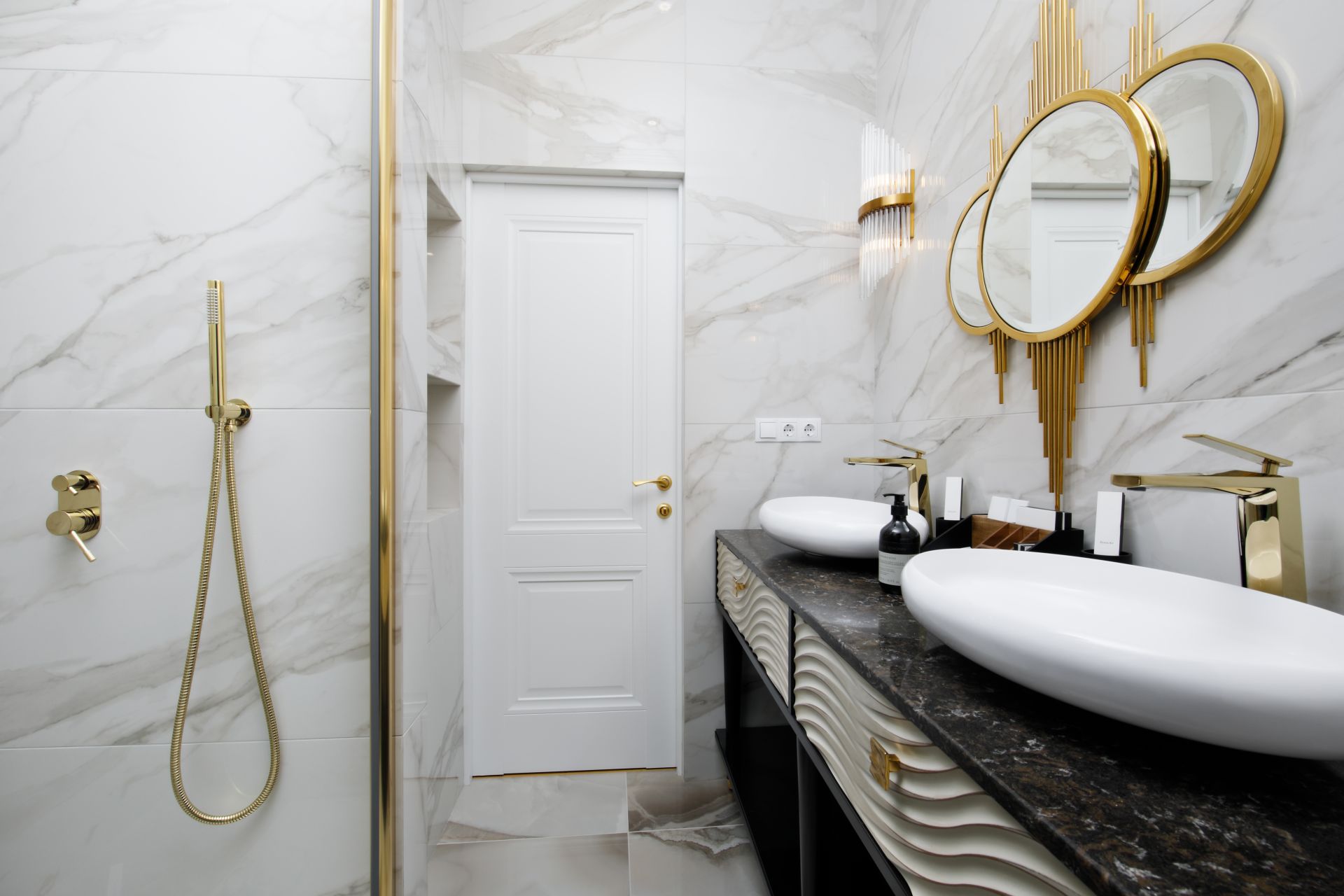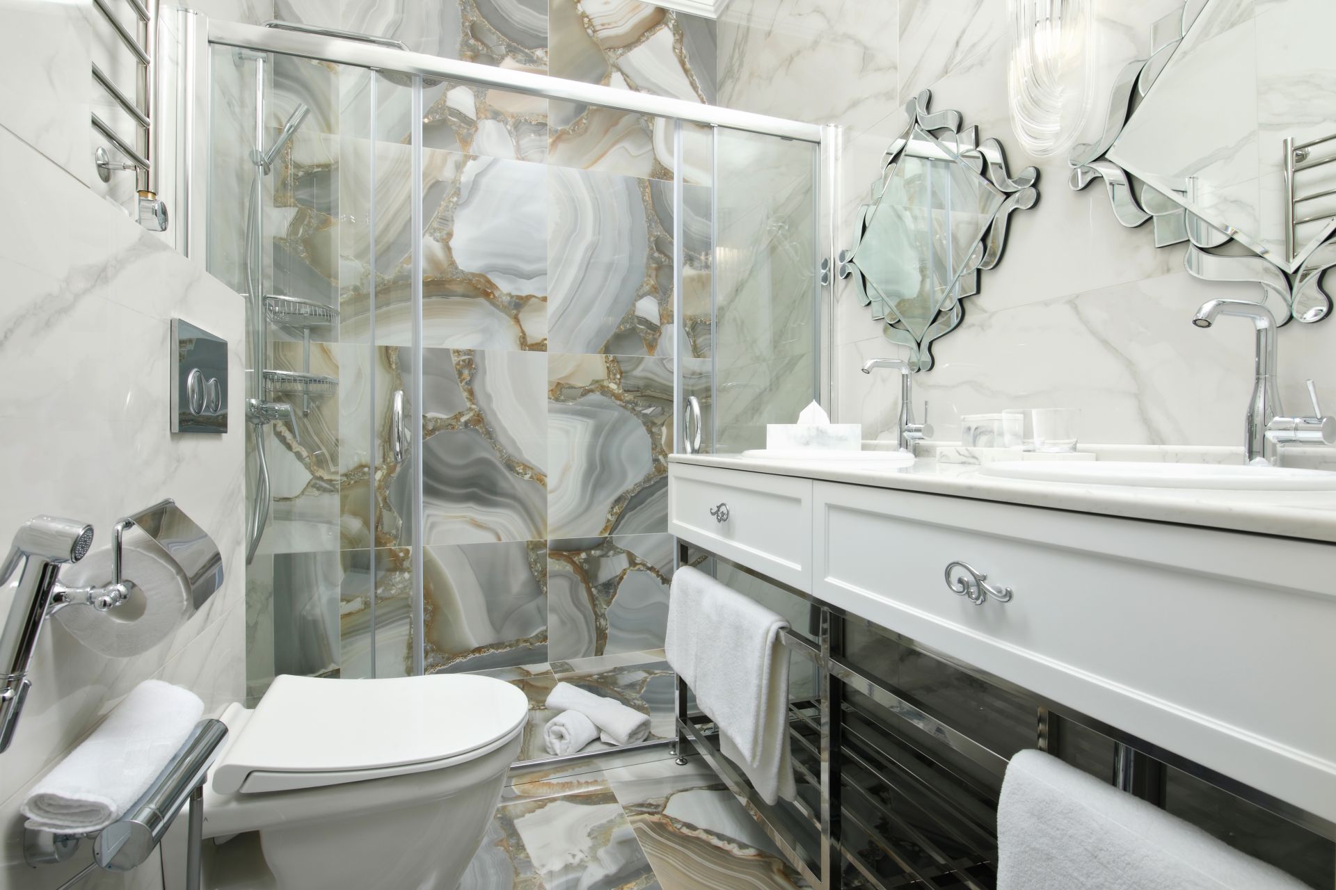 Санузел (два): душ, ванна, биде, раковина, унитаз, тапочки, туалетные принадлежности, фен, халат