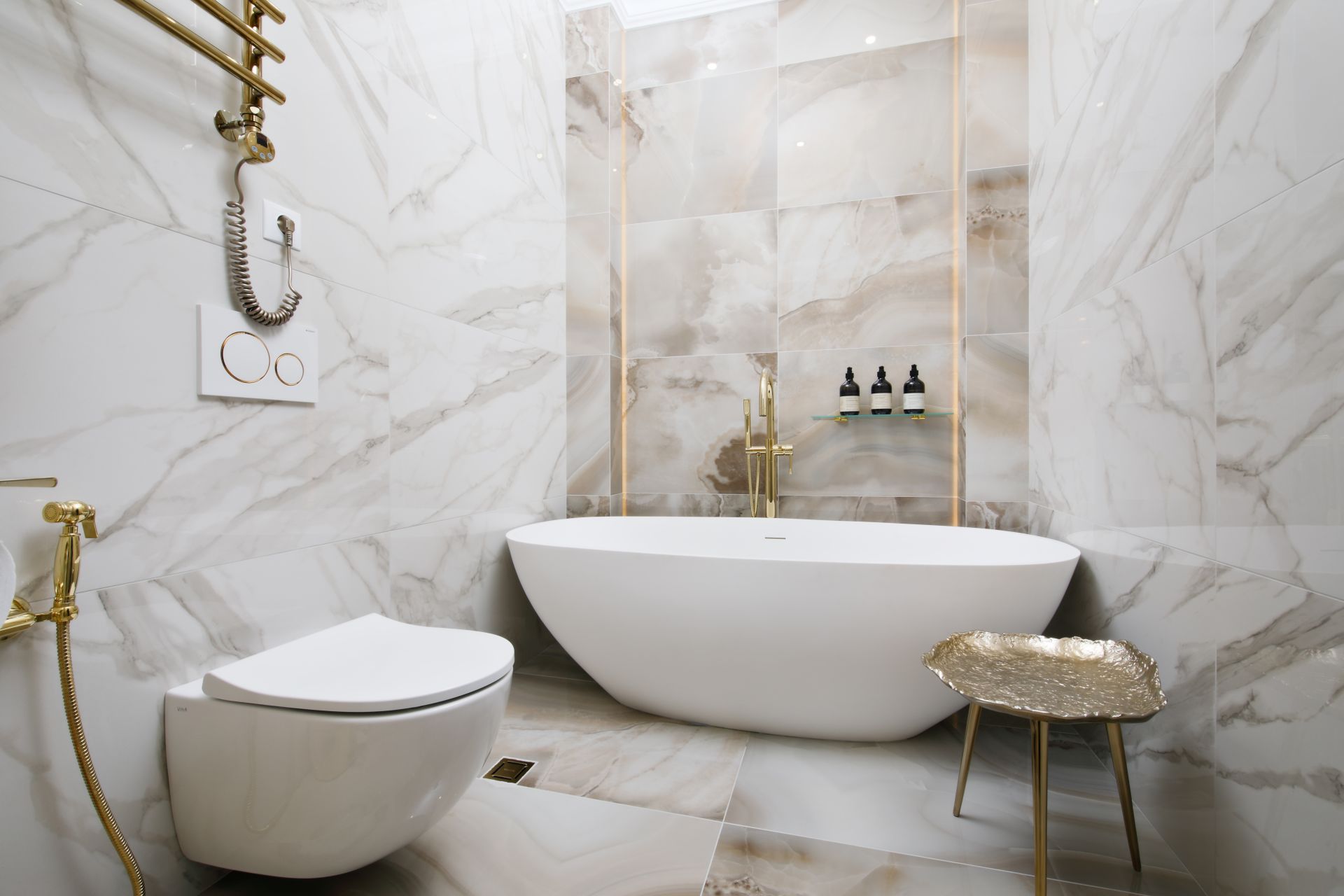 Санузел: душ, ванна, биде, раковина, унитаз, тапочки, туалетные принадлежности, фен, халат