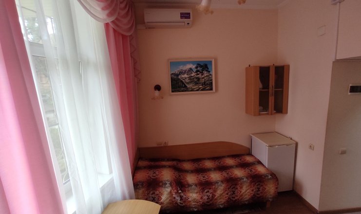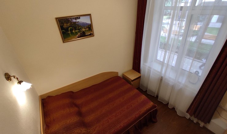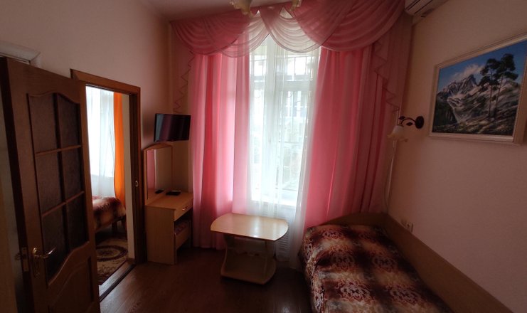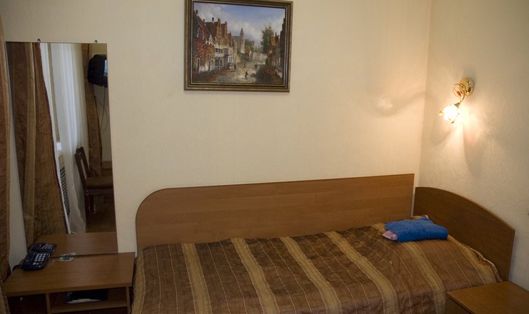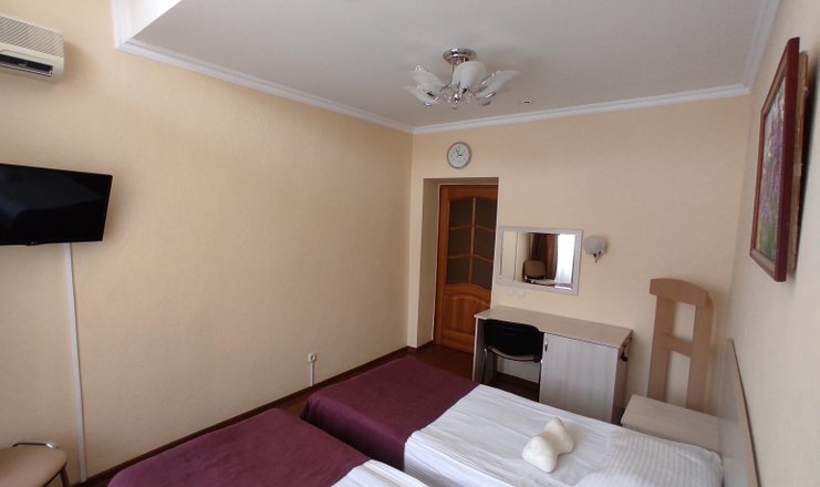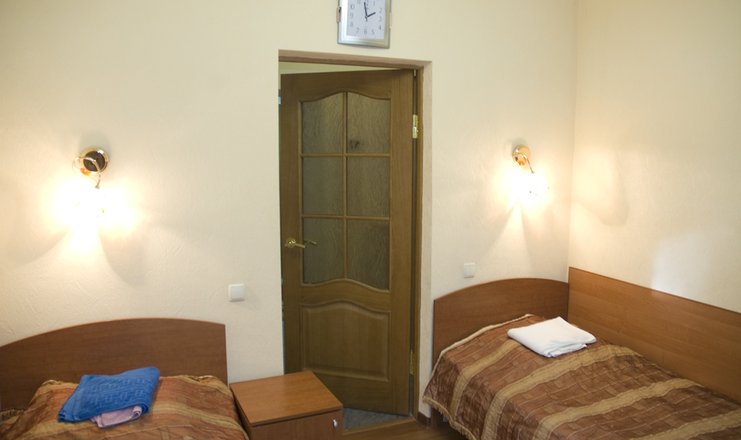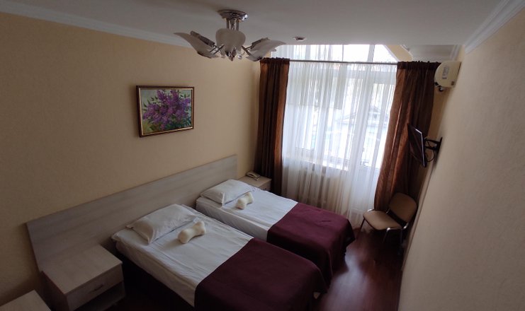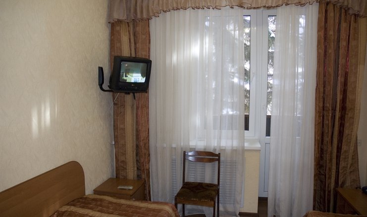 Оснащение номера: кровати односпальные, прикроватные тумбочки, столик журнальный, стулья, шкаф, телевизор, холодильник