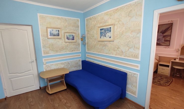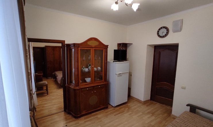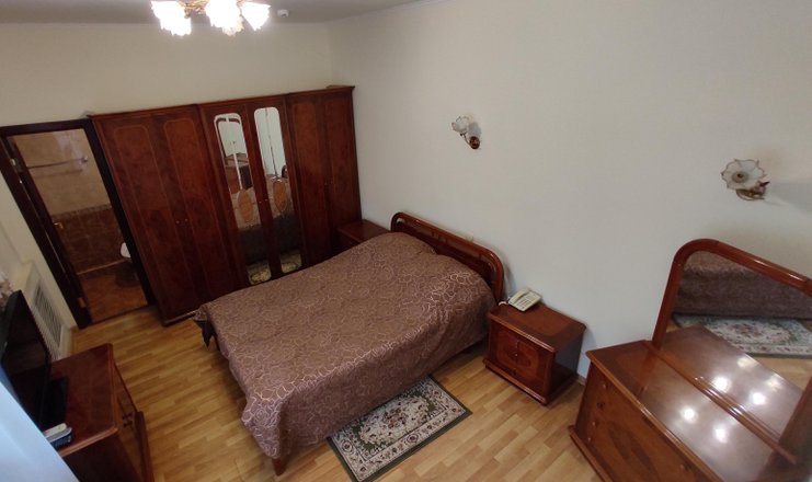Оснащение номера: кровать двуспальная, прикроватные тумбочки, столик журнальный, стулья, шкаф, диван, телевизор, холодильник, электрочайник