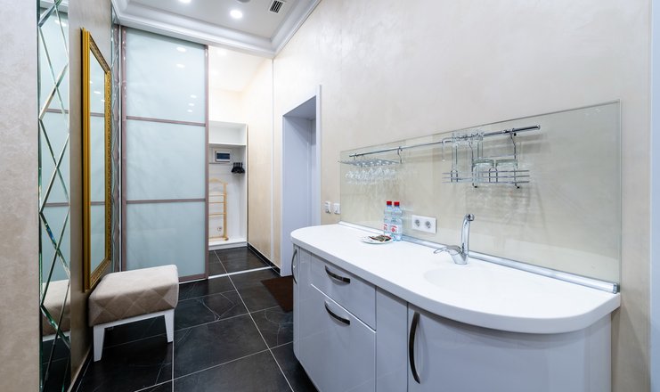 В номере: вешалка, гардеробная, диван, зеркало, комод, кресла, кровать двуспальная, набор мягкой мебели, прикроватные тумбочки, стол, столик туалетный, шкаф, шкаф-купе, мини-кухня, кондиционер, мини-холодильник, телевизор ЖК, утюг, чайный набор посуды, электрочайник