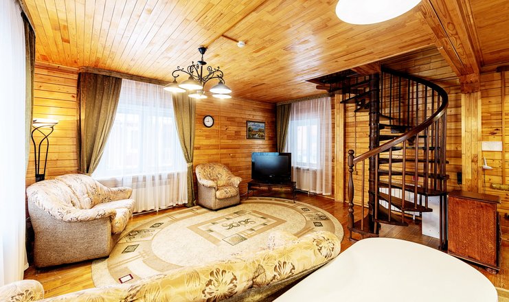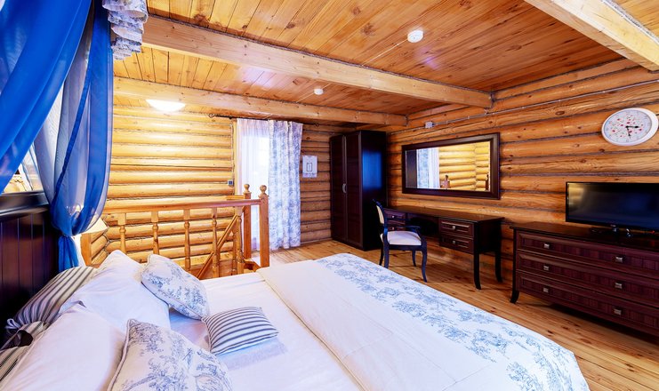 В номере: кровать двуспальная, набор мягкой мебели, прикроватные тумбочки, стол, столик туалетный, шкаф, мини-кухня, гладильная доска, камин, кондиционер, мини-холодильник, набор посуды, телевизор ЖК, холодильник, электрочайник