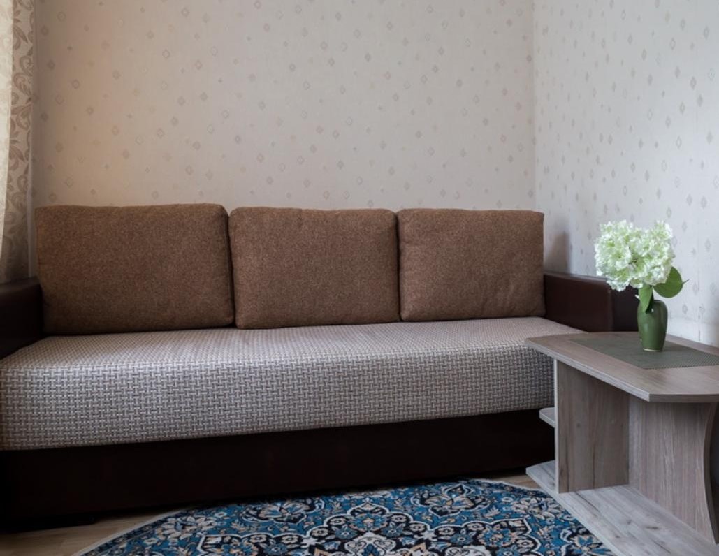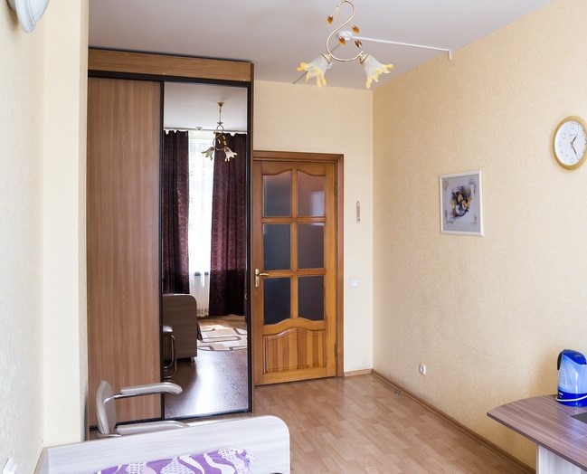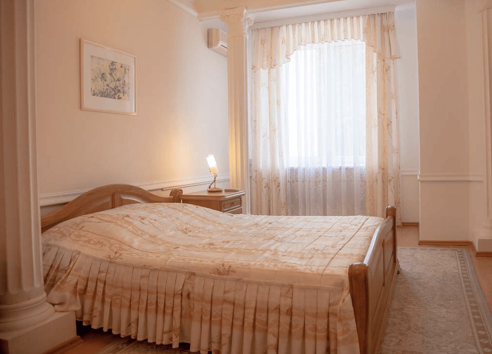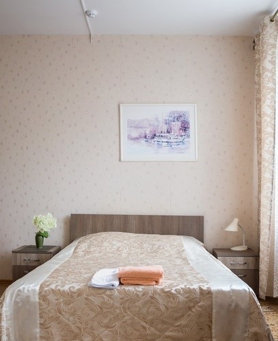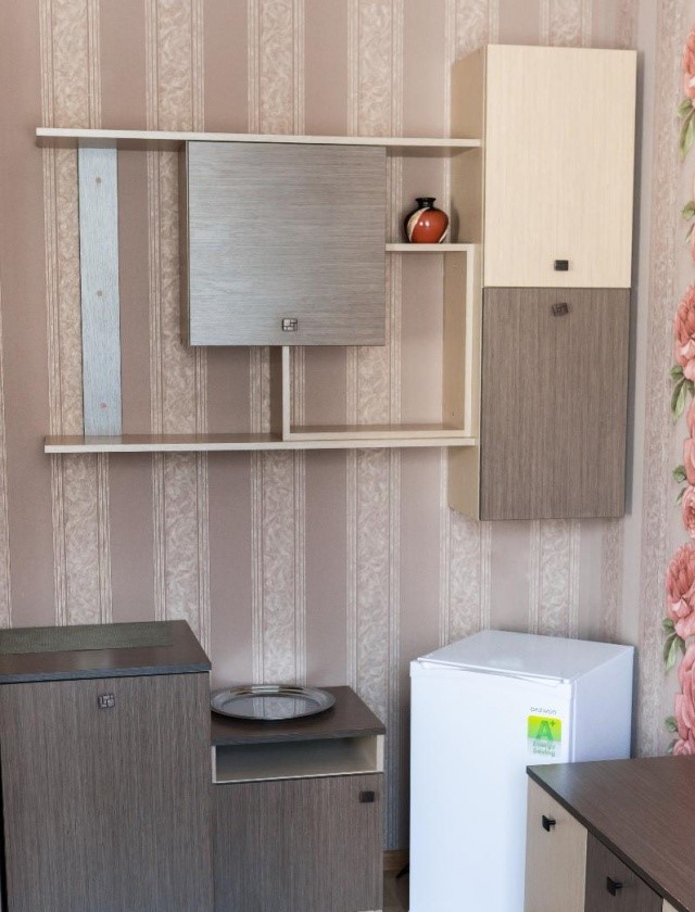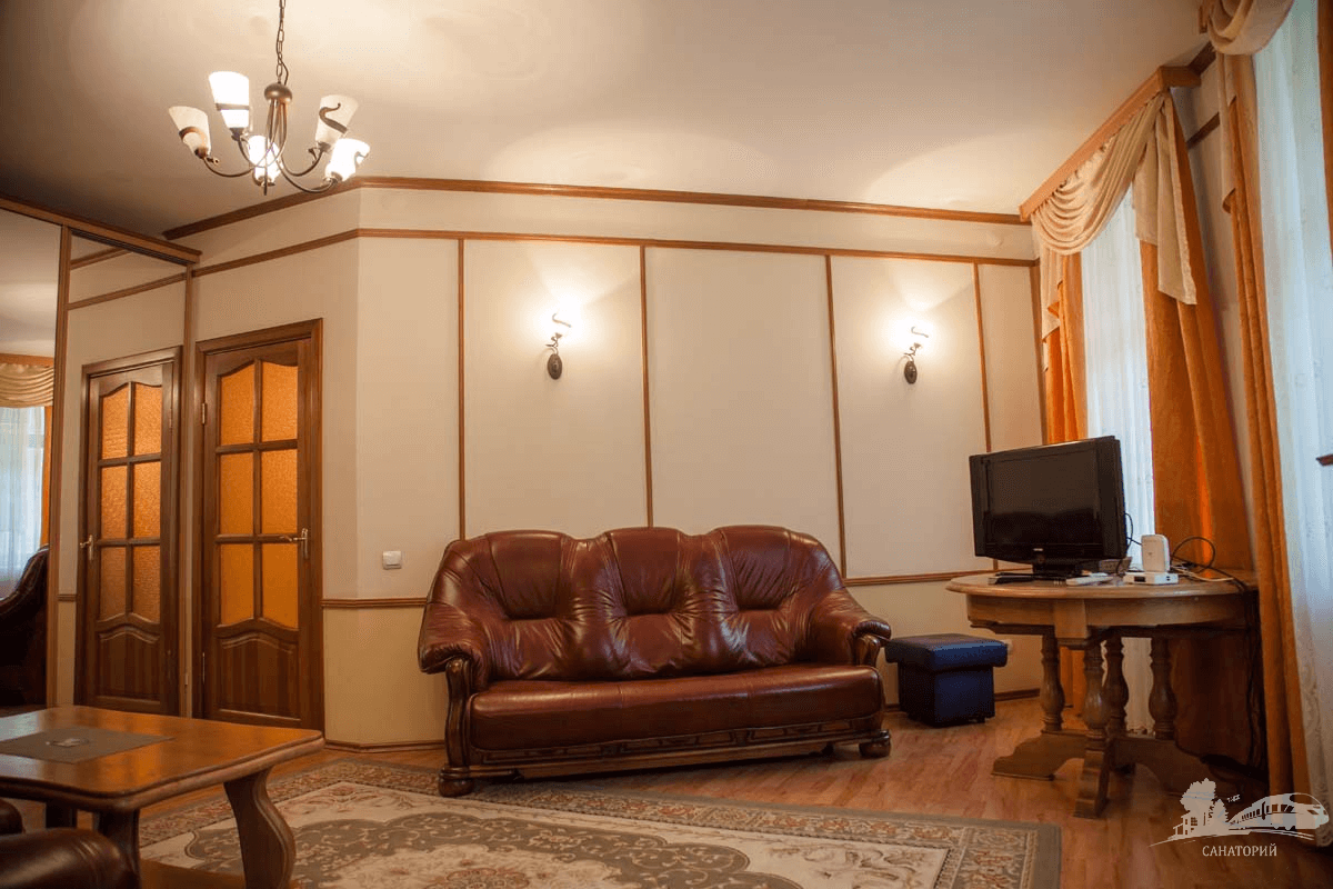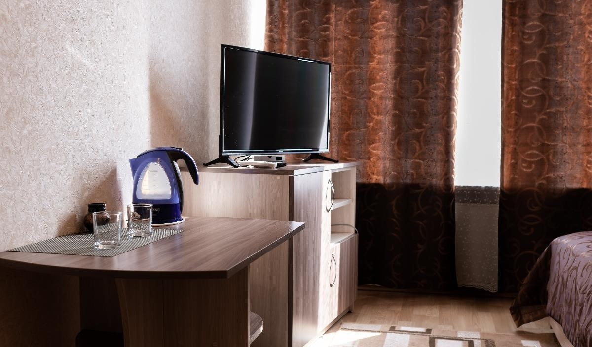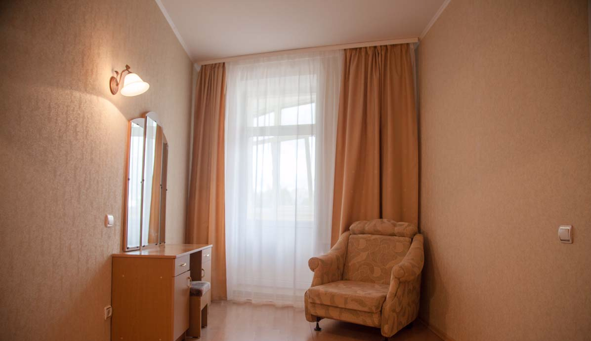 В номере: полутораспальная кровать, прикроватные тумбы, стол, стул, диван, шкаф, холодильник, электрочайник, микроволновая печь, телевизор, телефон