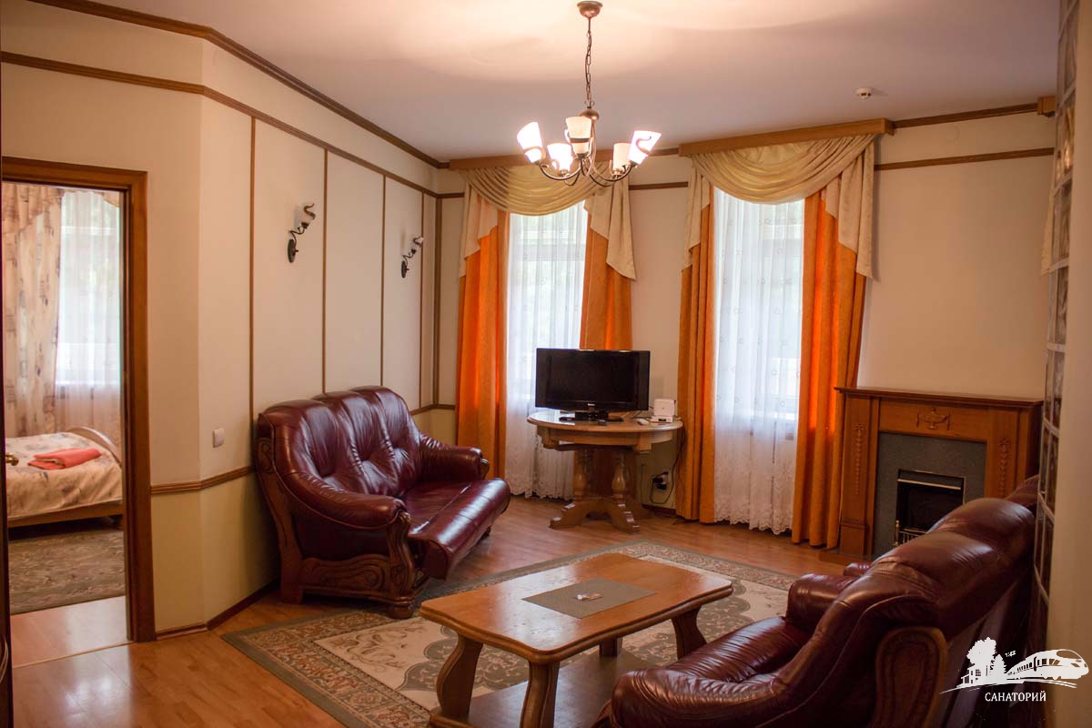 В номере: две комнаты: спальня и гостиная, двуспальная кровать, прикроватные тумбы, стол, стулья, мягкая мебель, шкаф, холодильник, шкаф для посуды. электрочайник, телевизор, телефон