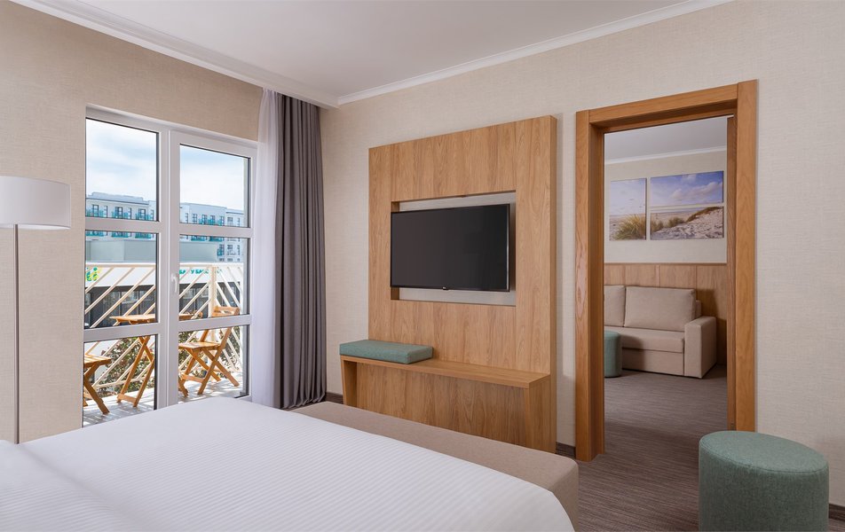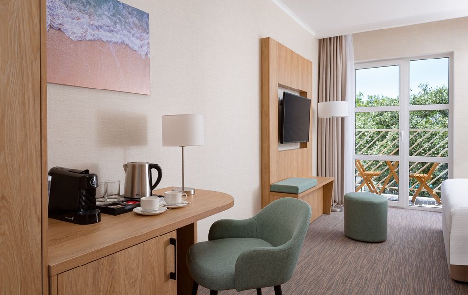В номере: вешалка, диван, зеркало, кровать двуспальная, прикроватные тумбочки, стол, стулья, шкаф, гладильная доска, кофемашина, мини-холодильник, сейф, сплит-система, телевизор ЖК, телефон, утюг, чайный набор посуды, электрочайник