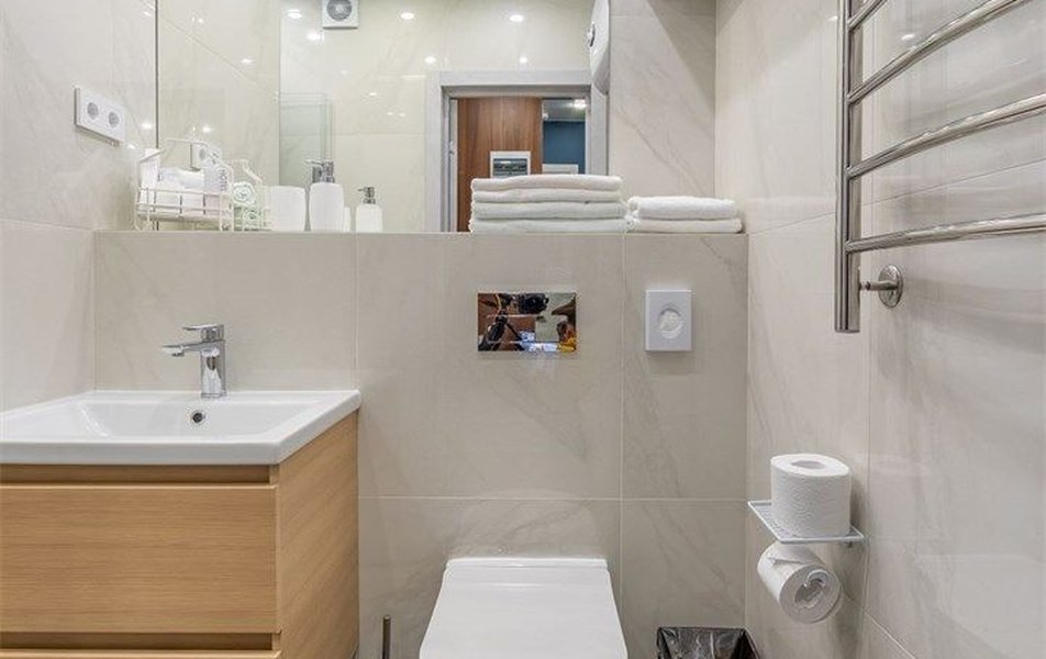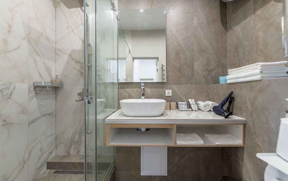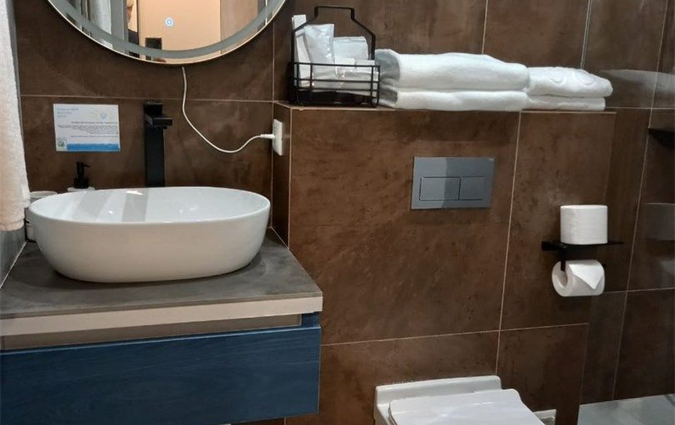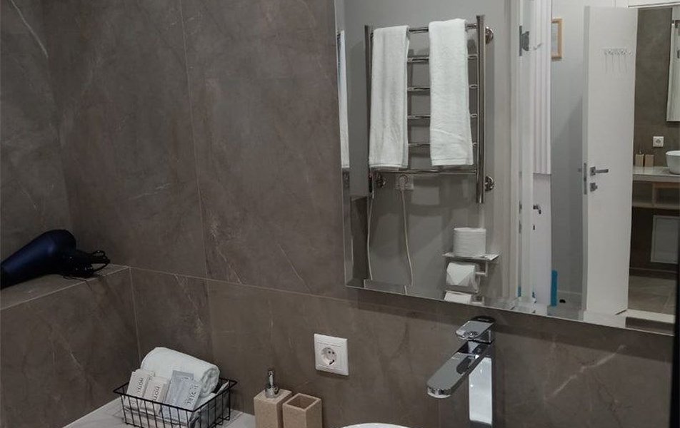 Санузел: с душем, тапочки, туалетные принадлежности, фен, халат