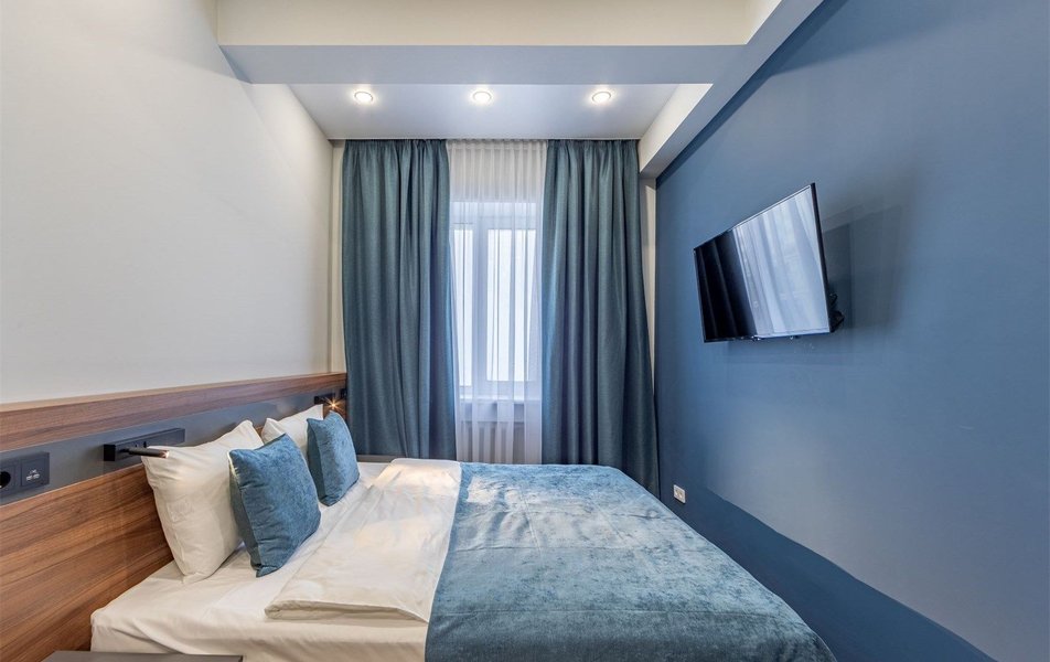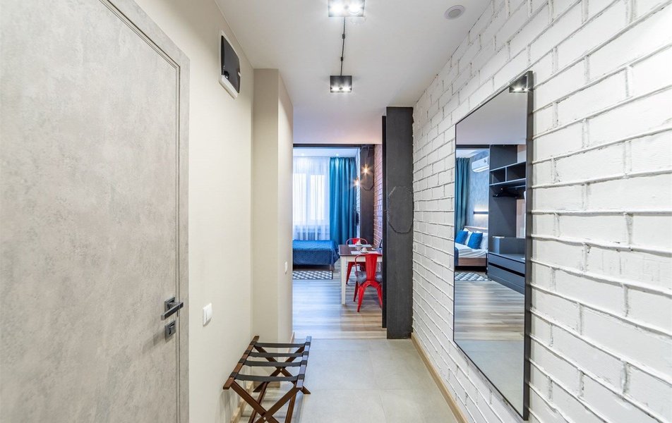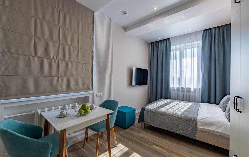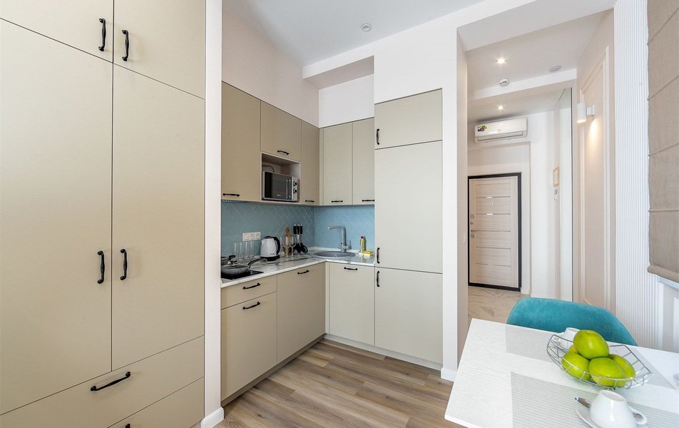 В номере: вешалка, зеркало, кровать двуспальная, прикроватные тумбочки, стол, стулья, шкаф, Мини-кухня, кондиционер, микроволновая печь, мини-холодильник, набор посуды, плита электрическая, стиральная машина, телевизор, чайный набор посуды, электрочайник