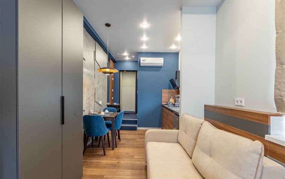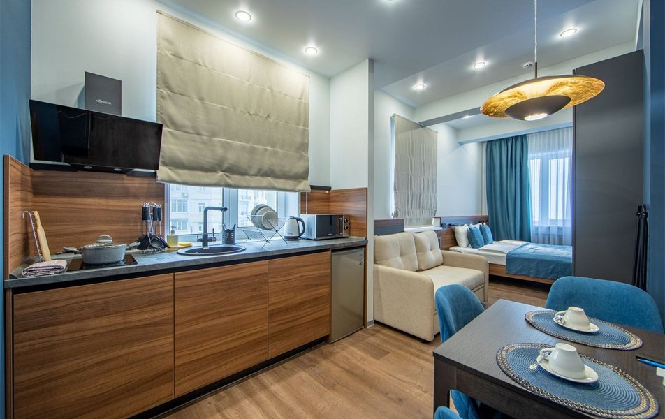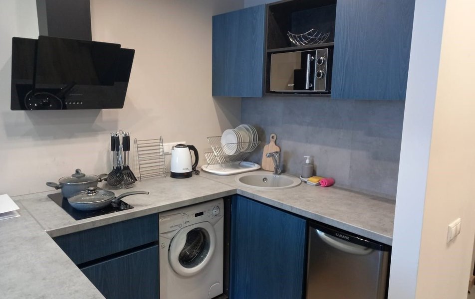 В номере: вешалка, диван, зеркало, кровать двуспальная, прикроватные тумбочки, стол, стулья, шкаф, Мини-кухня, кондиционер, микроволновая печь, мини-холодильник, набор посуды, плита электрическая, стиральная машина, телевизор, чайный набор посуды, электрочайник