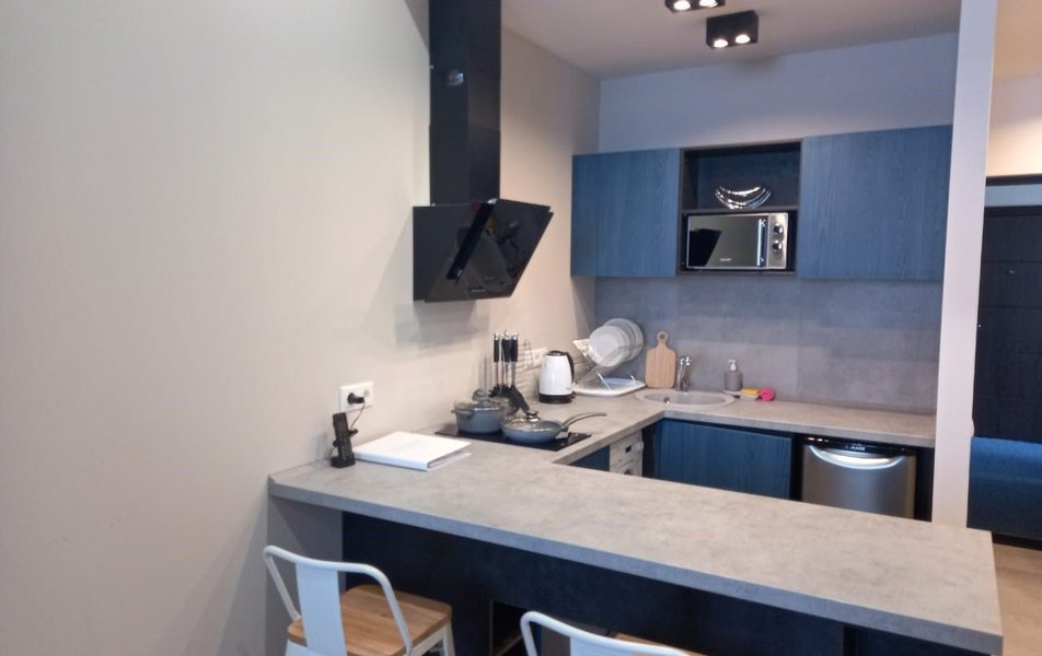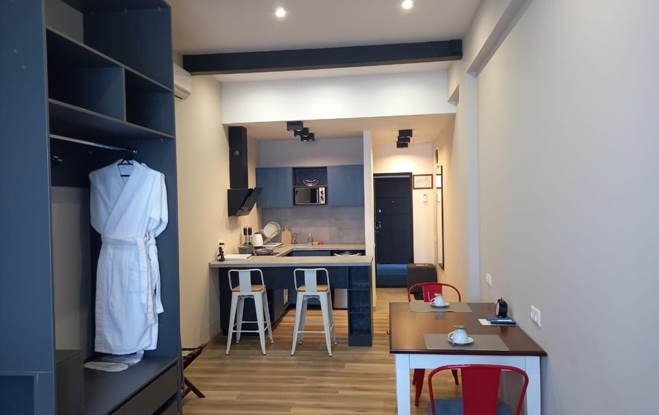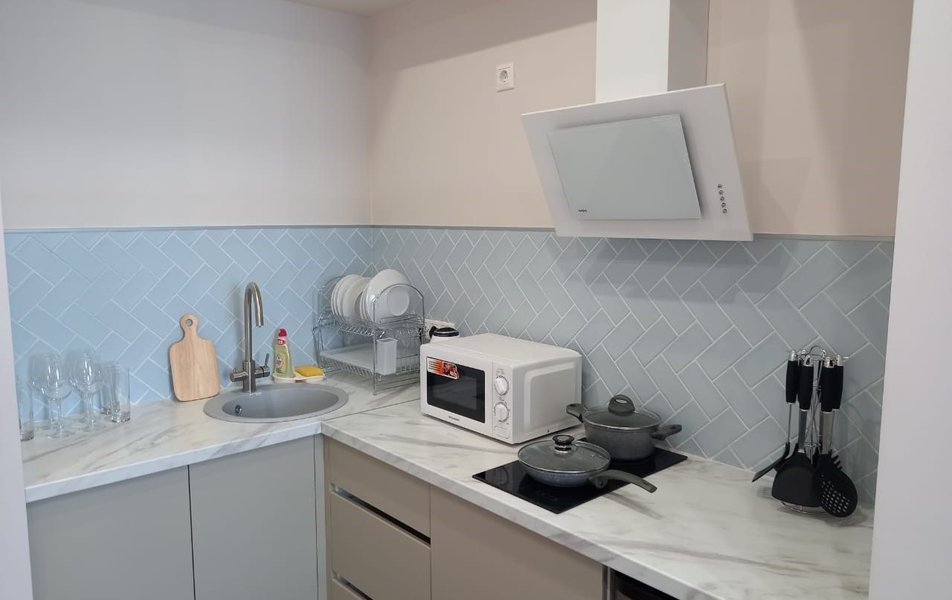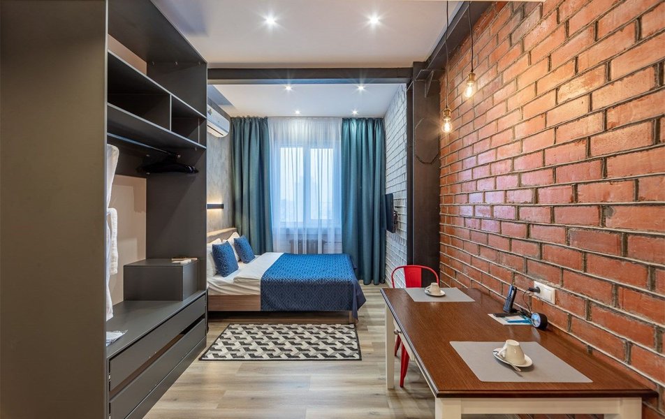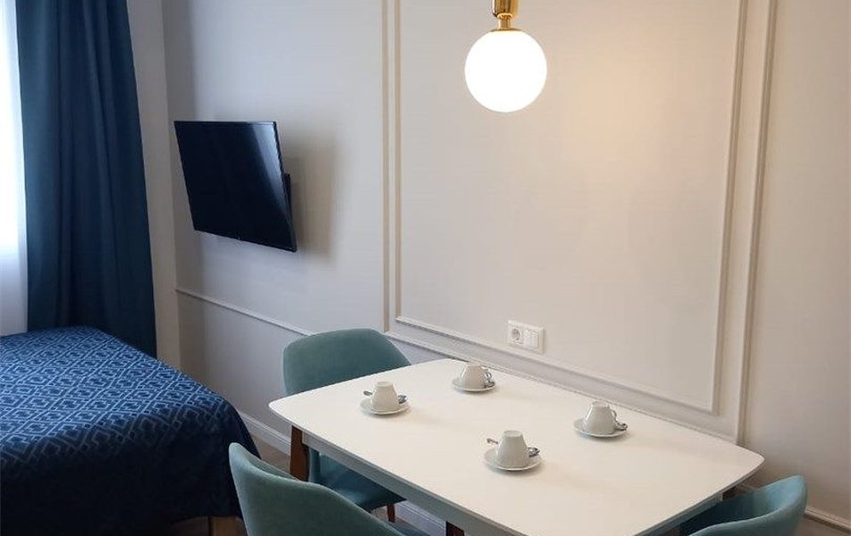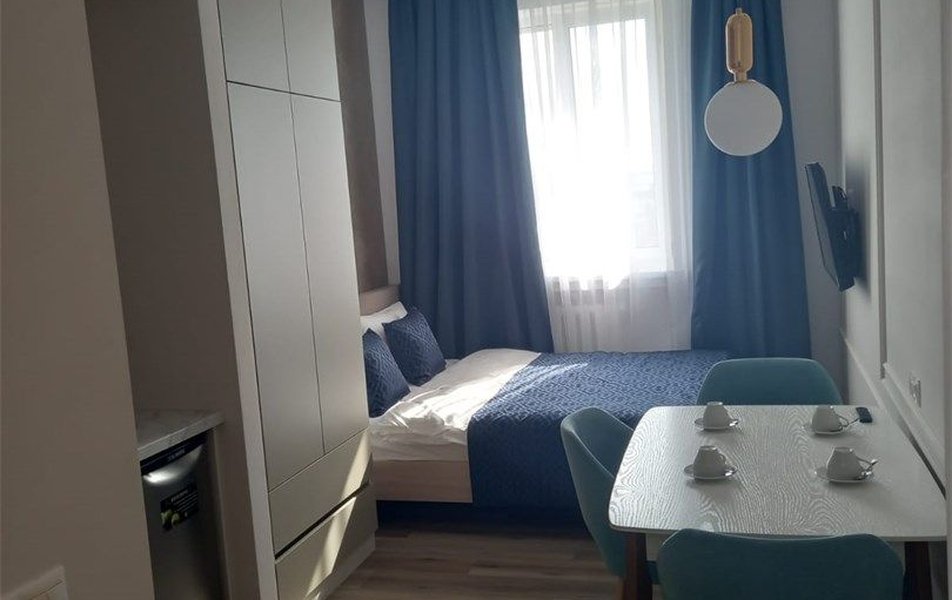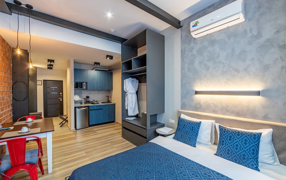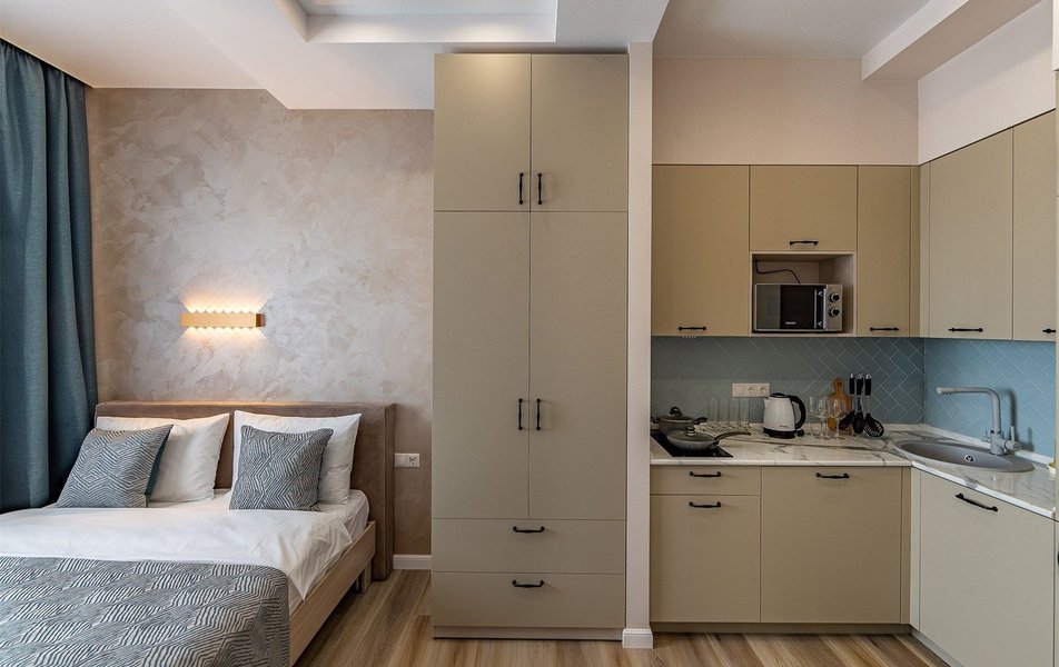 В номере: вешалка, зеркало, кровать двуспальная, прикроватные тумбочки, стол, стулья, шкаф, Мини-кухня, кондиционер, микроволновая печь, мини-холодильник, набор посуды, плита электрическая, телевизор, чайный набор посуды, электрочайник