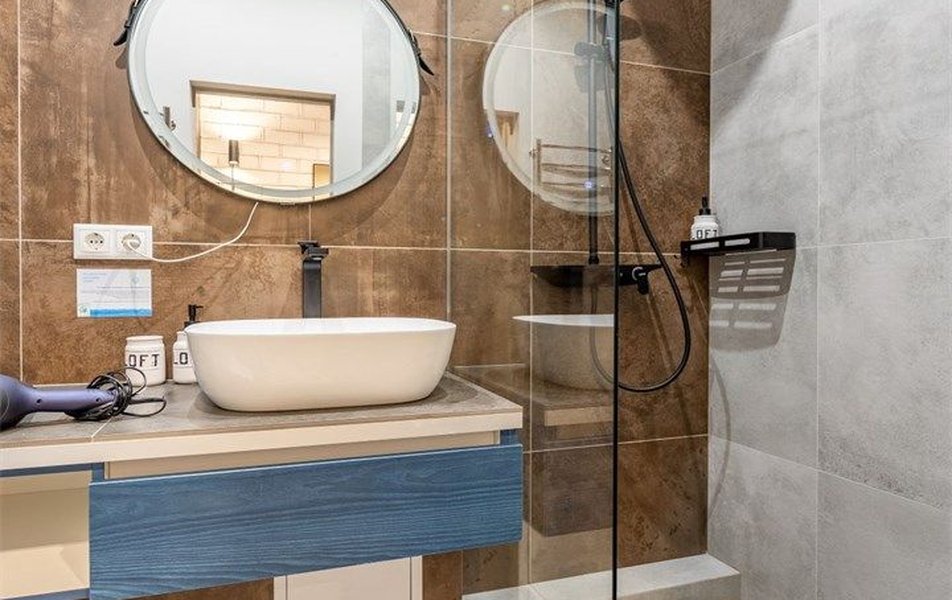 Санузел: с душевой кабиной, тапочки, туалетные принадлежности, фен, халат