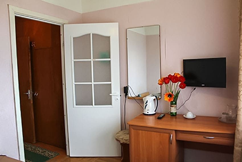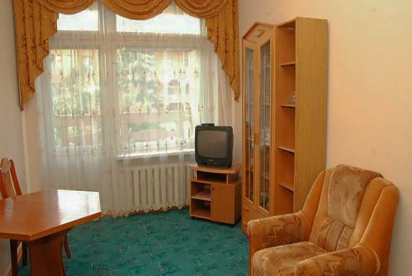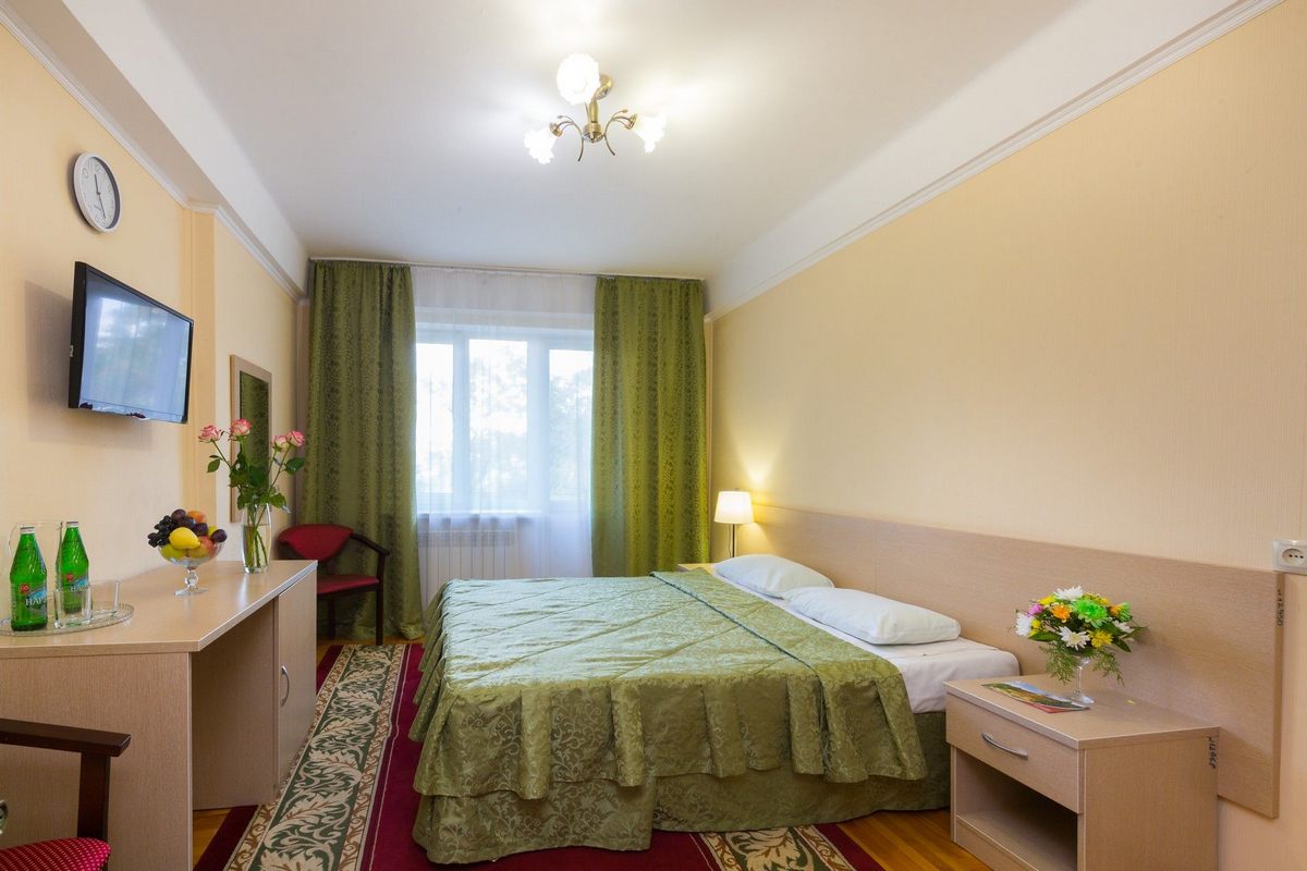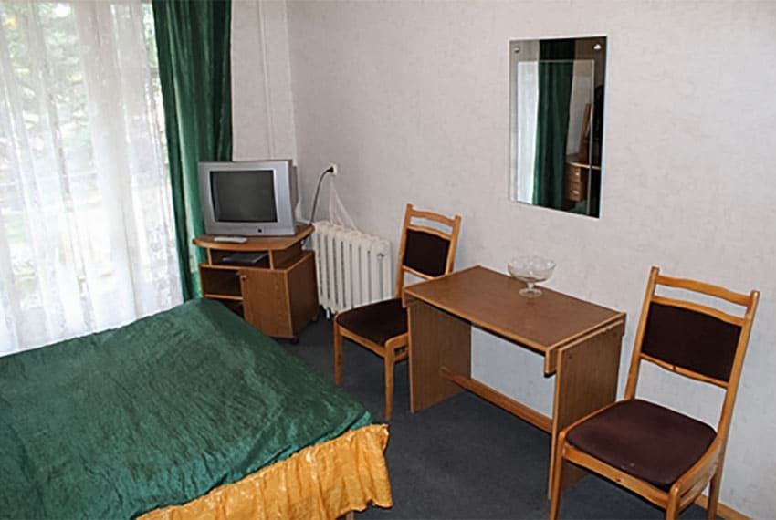 Оснащение номера: односпальная кровать, тумба прикроватная, стол, стул, шкаф, телевизор, холодильник, набор посуды, электрический чайник
