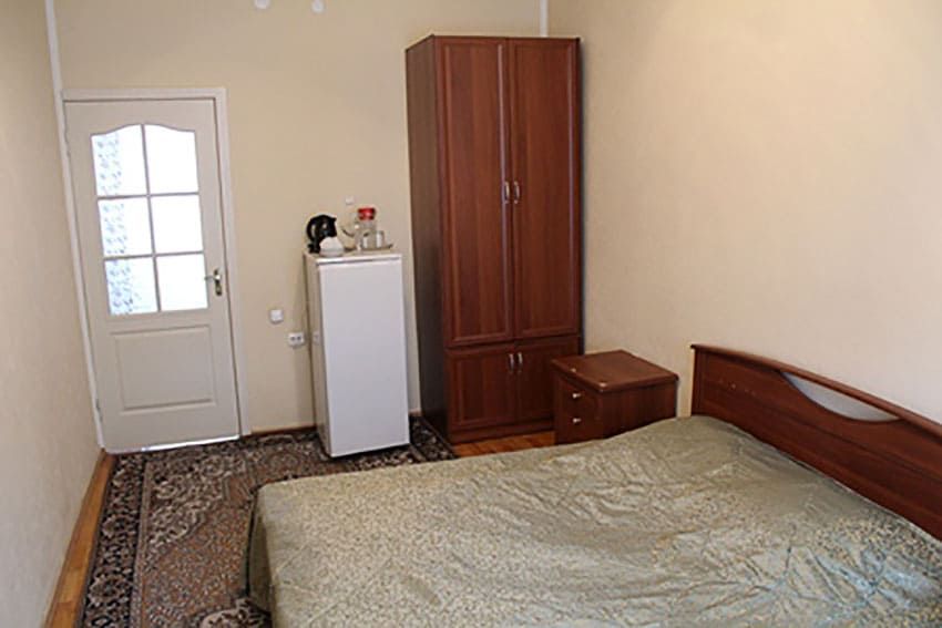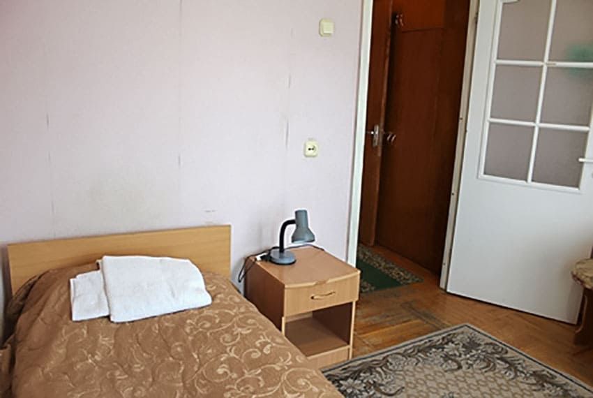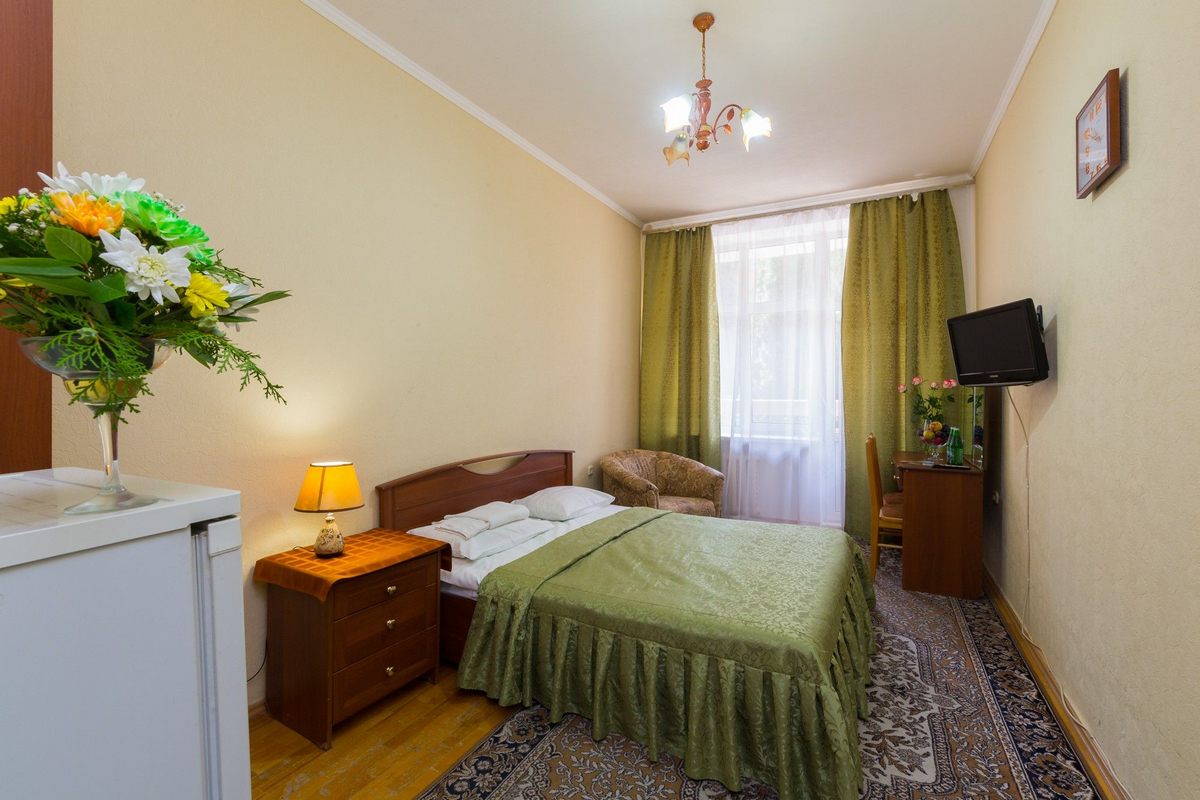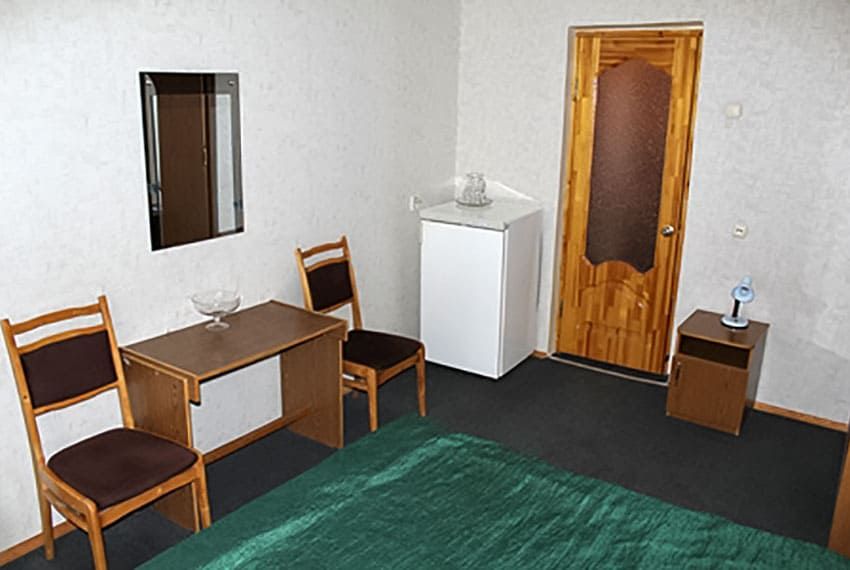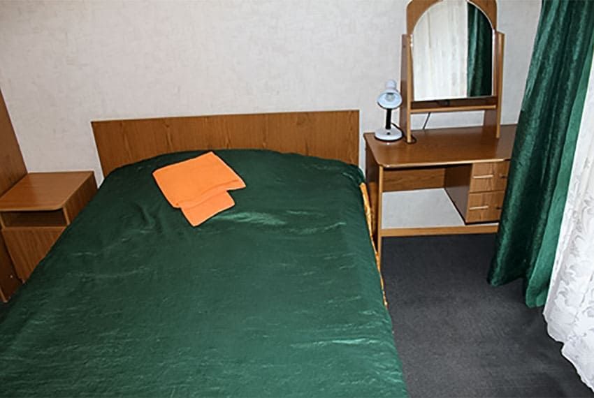 Оснащение номера: кровать односпальная, тумба прикроватная, стол, стул, шкаф, телевизор, холодильник, набор посуды, электрический чайник