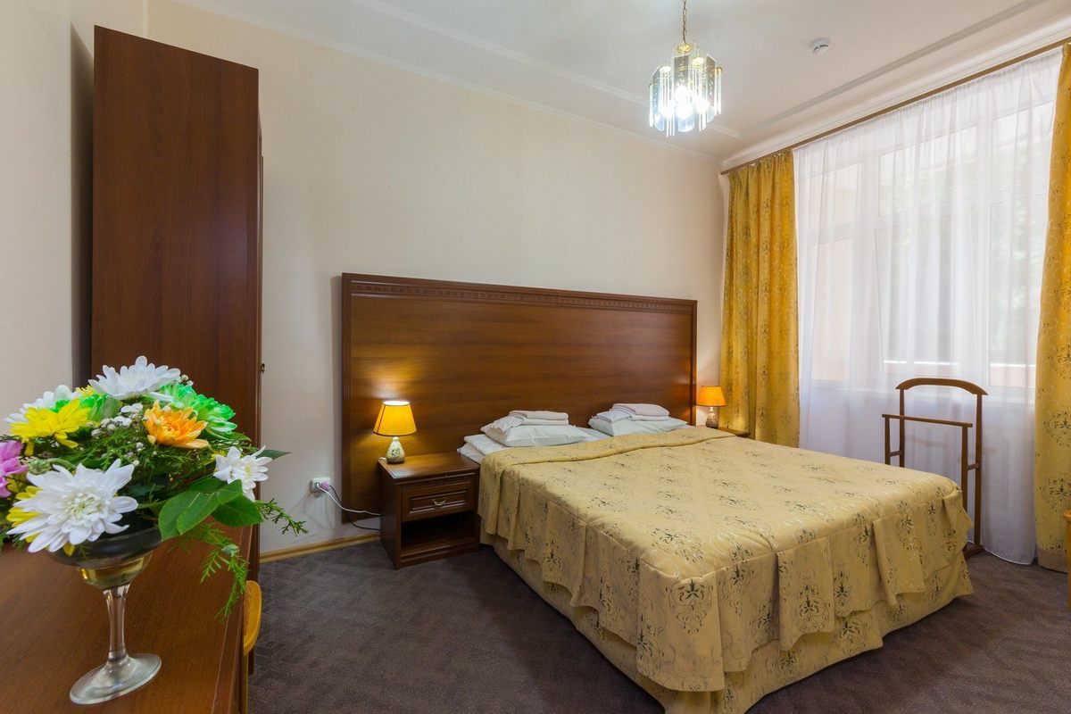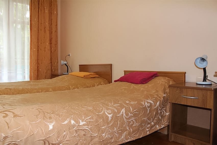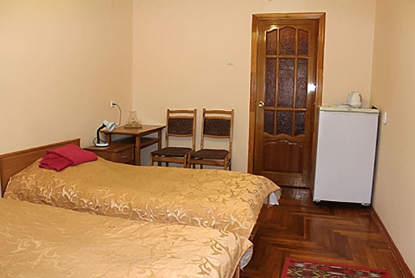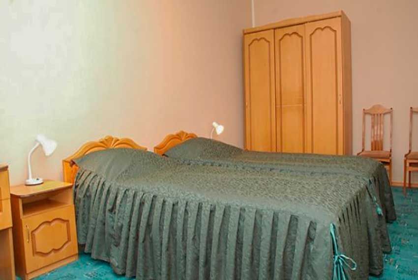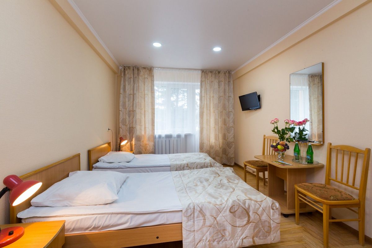 Оснащение номера: две односпальные кровати, прикроватные тумбы, стол, стулья, шкаф, телевизор, холодильник