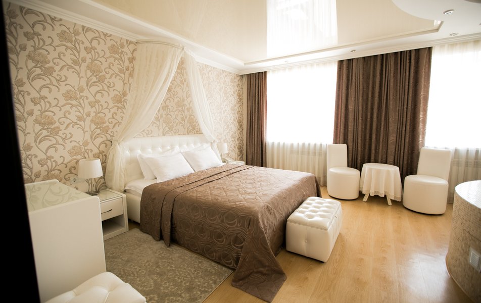 В номере: диван: или кресло, кровать двуспальная, прикроватные тумбочки, стол, столик журнальный, стулья, тумба багажная, шкаф, кондиционер, сейф, телевизор, телефон, холодильник, чайный набор посуды, электрочайник