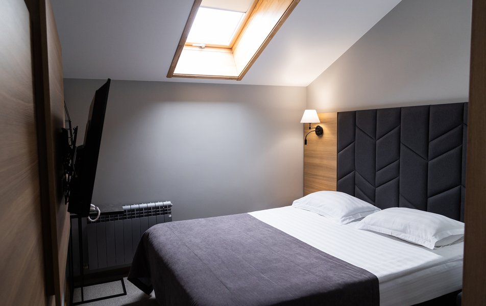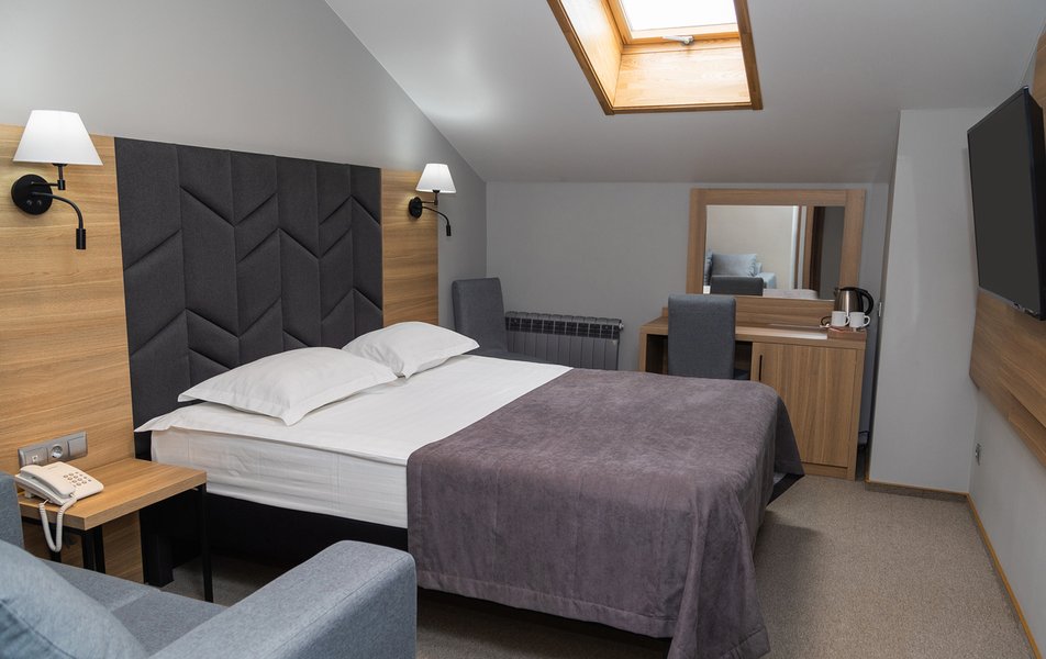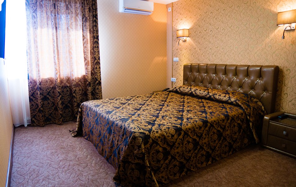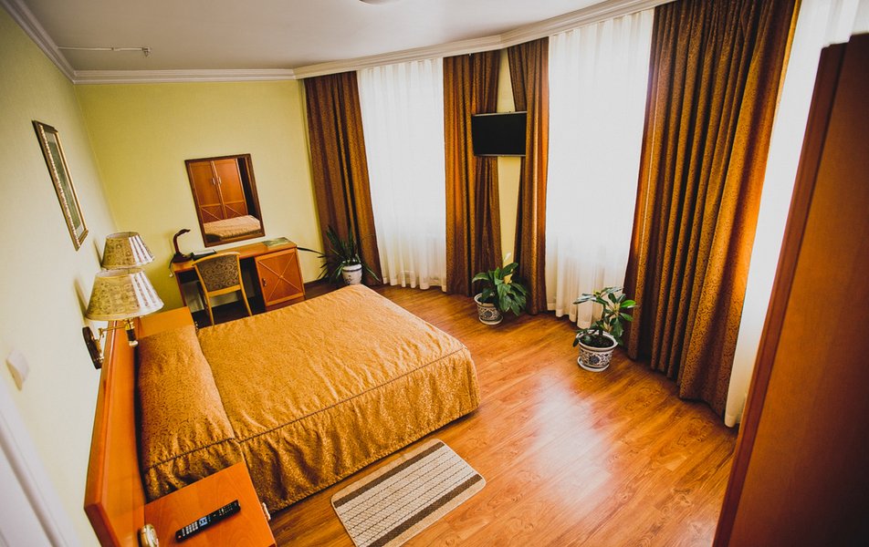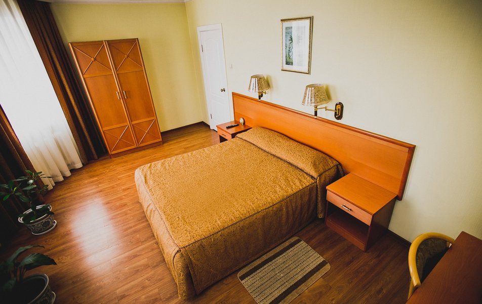 В номере: кровать двуспальная, прикроватные тумбочки, стол, стулья, шкаф, гладильная доска, кондиционер, сейф, телевизор, телефон, утюг, холодильник, чайный набор посуды, электрочайник