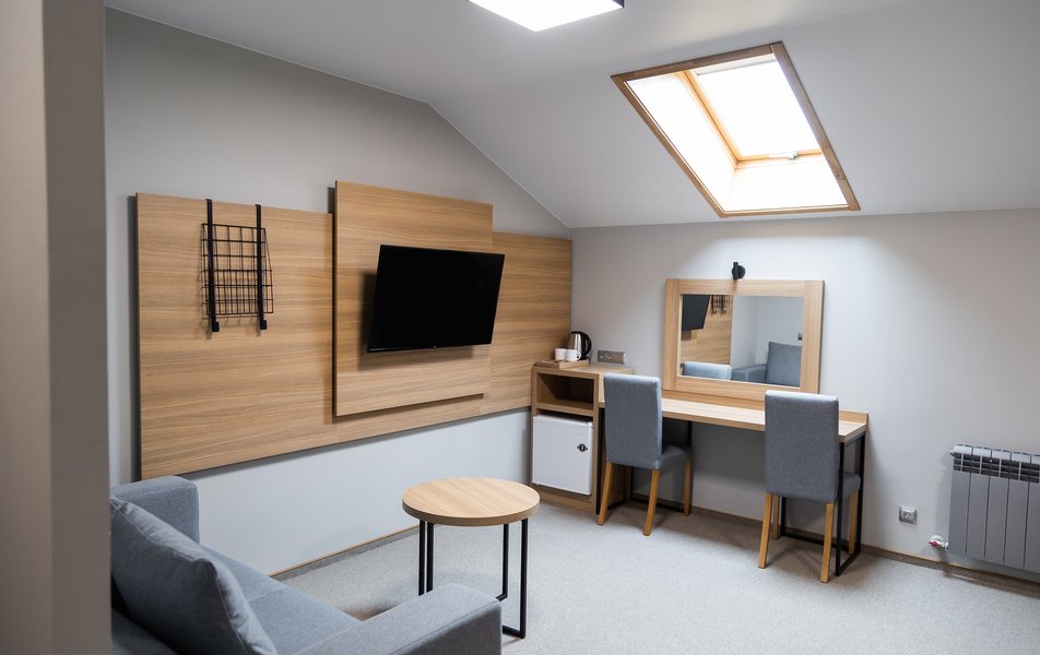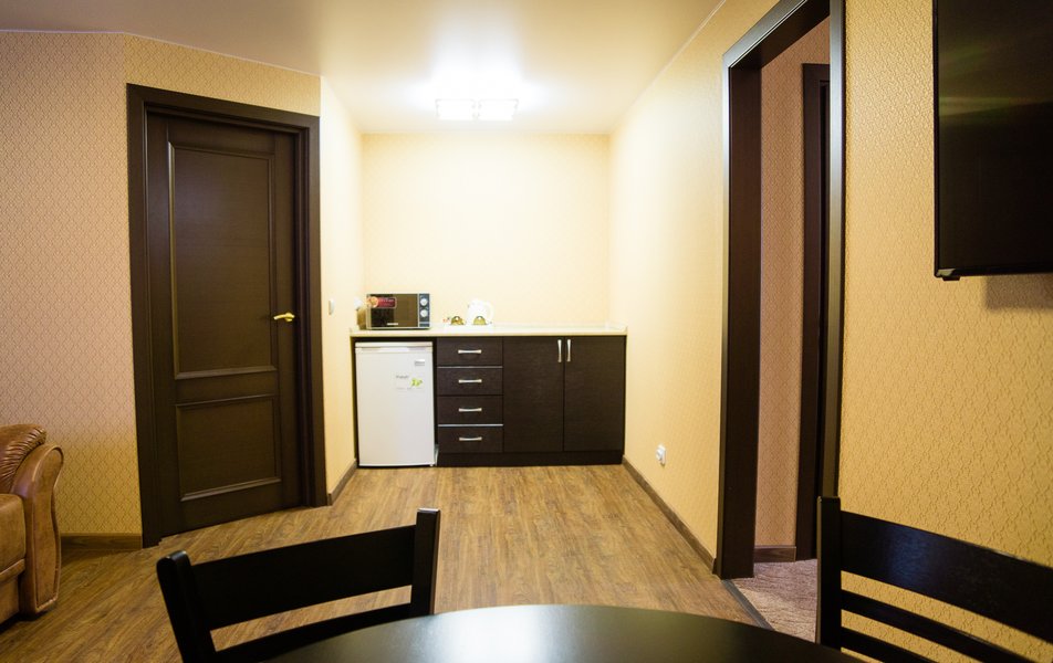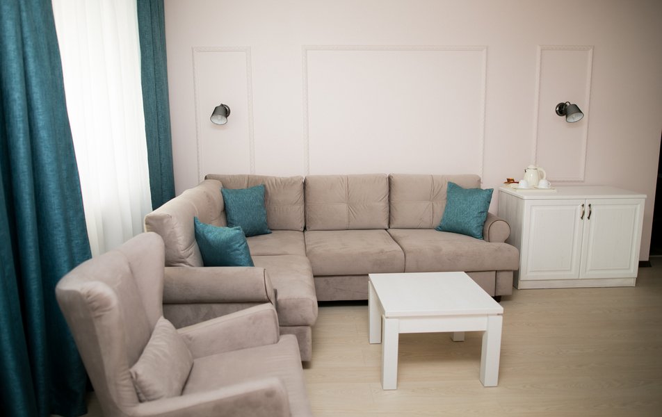 В номере: диван раскладной, кресла, кровать двуспальная, прикроватные тумбочки, стол, столик журнальный, стул, шкаф, Мини-кухня, гладильная доска, кондиционер, микроволновая печь, набор посуды, сейф, телевизор, телефон, утюг, холодильник, электрочайник