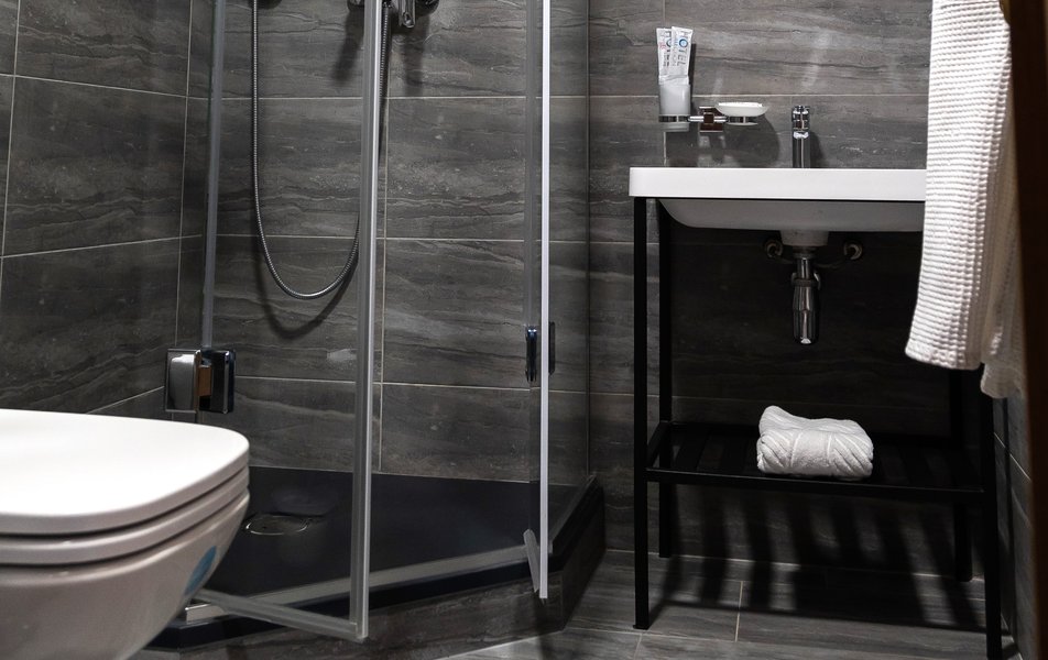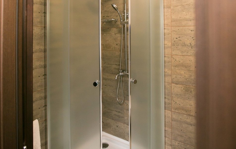 Санузел: с душевой кабиной, тапочки, туалетные принадлежности, фен, халат