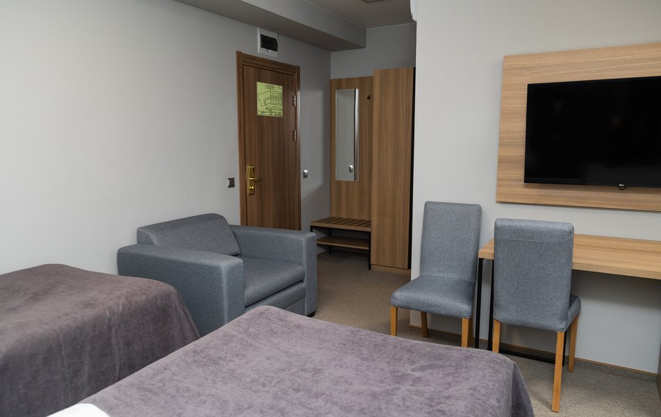 В номере: кресло: или диван, кровати односпальные, прикроватные тумбочки, стол, столик журнальный, стулья, шкаф, кондиционер, сейф, телевизор, телефон, холодильник, чайный набор посуды, электрочайник
