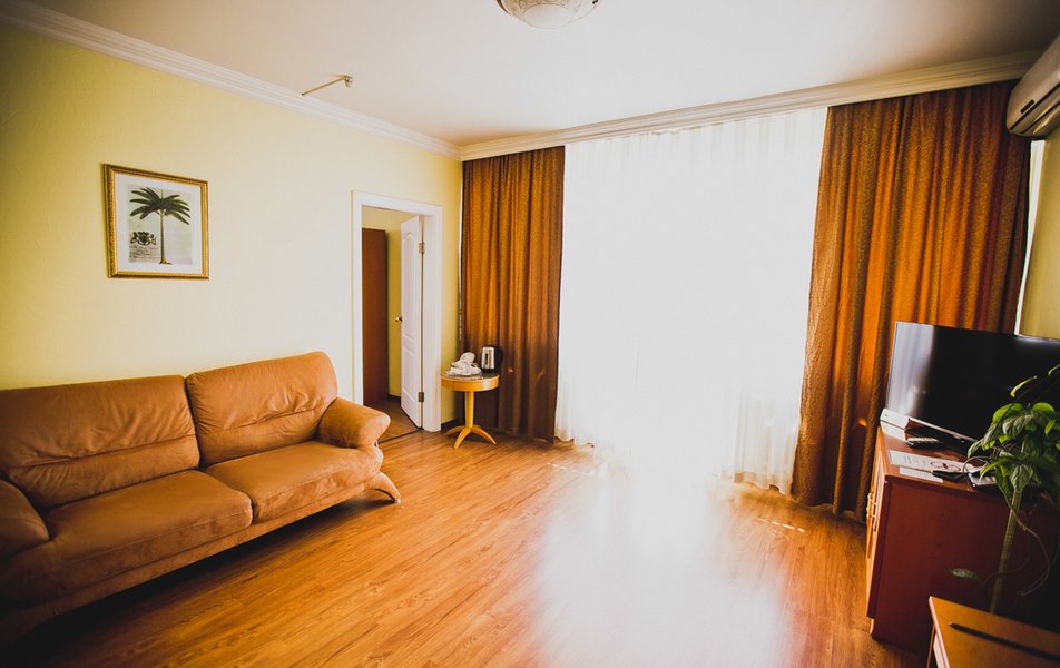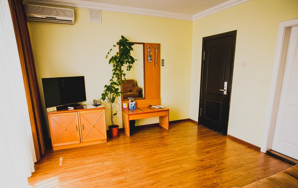 В номере: вешалка, диван, кровать двуспальная, прикроватные тумбочки, стол, стул, тумба под телевизор, шкаф, кондиционер, сейф, телевизор, телефон, холодильник, чайный набор посуды, электрочайник
