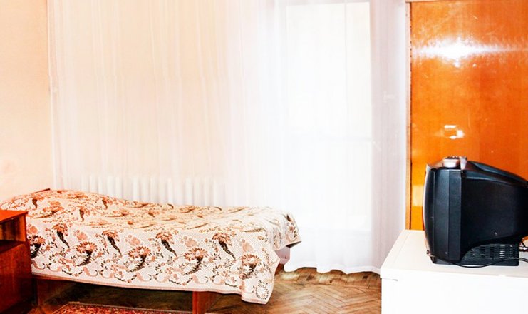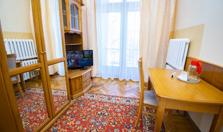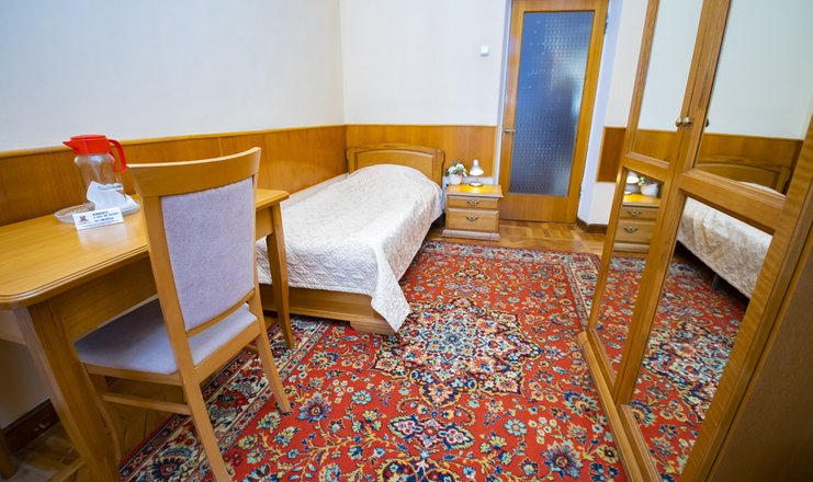 Оснащение номера: односпальная кровать, прикроватные тумбочки, стол, стул, шкаф для одежды, телевизор, холодильник, электрический чайник