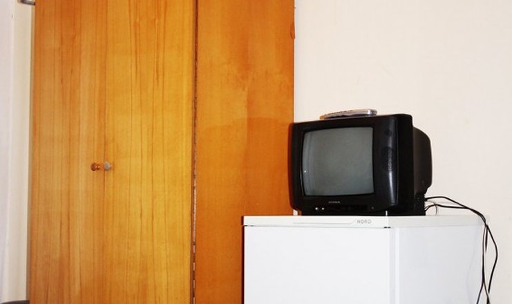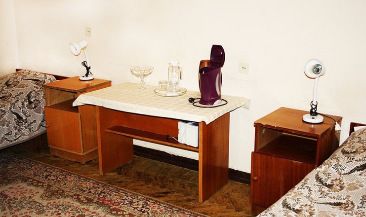 Оснащение номера: две односпальные кровати, прикроватные тумбочки, стол, стулья, телевизор, холодильник, набор посуды, электрический чайник
