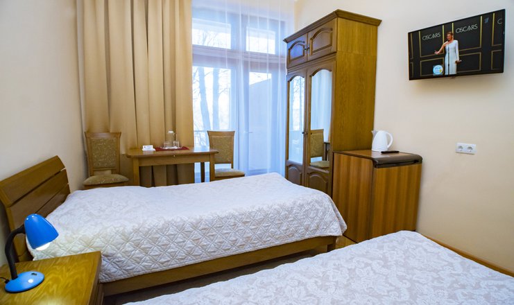 Оснащение номера: две односпальные кровати, прикроватные тумбочки, столик журнальный, телевизор, холодильник, набор посуды, электрический чайник