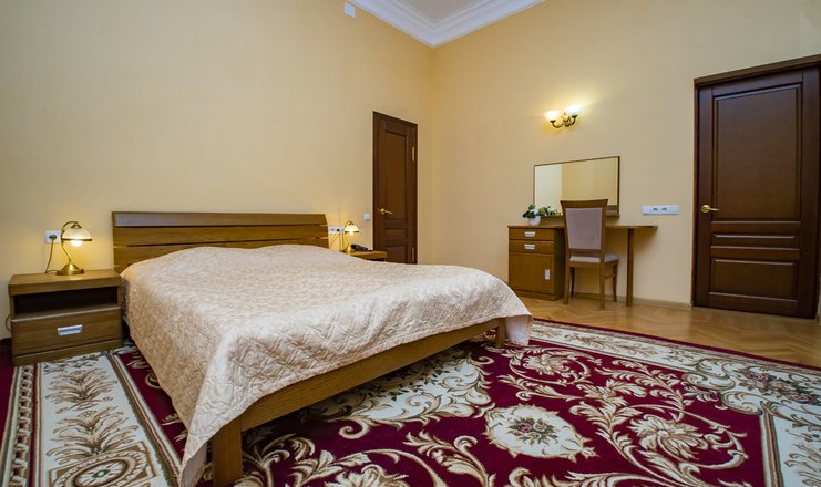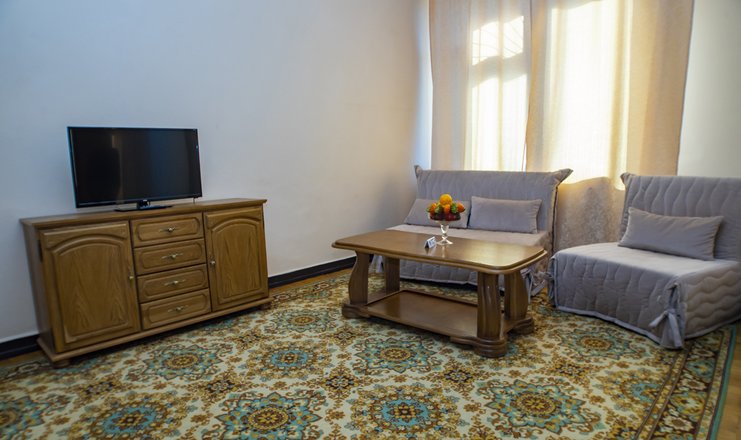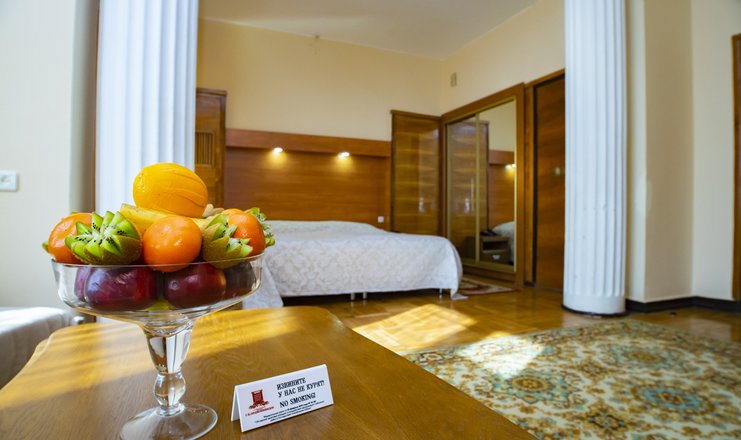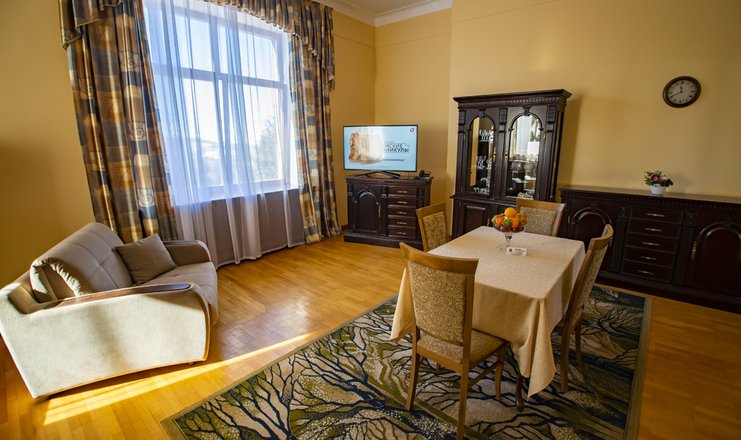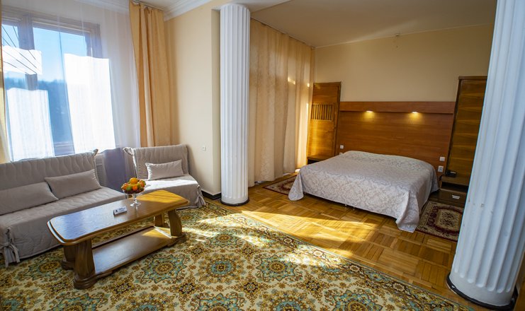 Оснащение номера: двуспальная кровать, прикроватные тумбочки, стол, стулья, набор мягкой мебели, шкаф для одежды, журнальный столик, телевизор, холодильник, набор посуды, электрический чайник