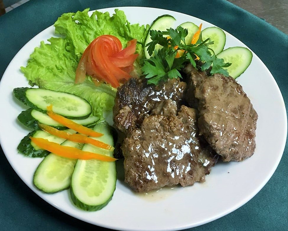 В ресторане подают блюда русской и европейской кухни, но также могут приготовить ваше любимое блюдо на заказ. Мастера поварского искусства, работающие в нашем ресторане, предложат вам изысканные блюда из парного мяса и свежей речной рыбы. У нас вы можете отведать по предзаказу фаршированного гуся или стерлядь по-царски. Всегда в наличии вкуснейшие оригинальные пельмешки ручной лепки.