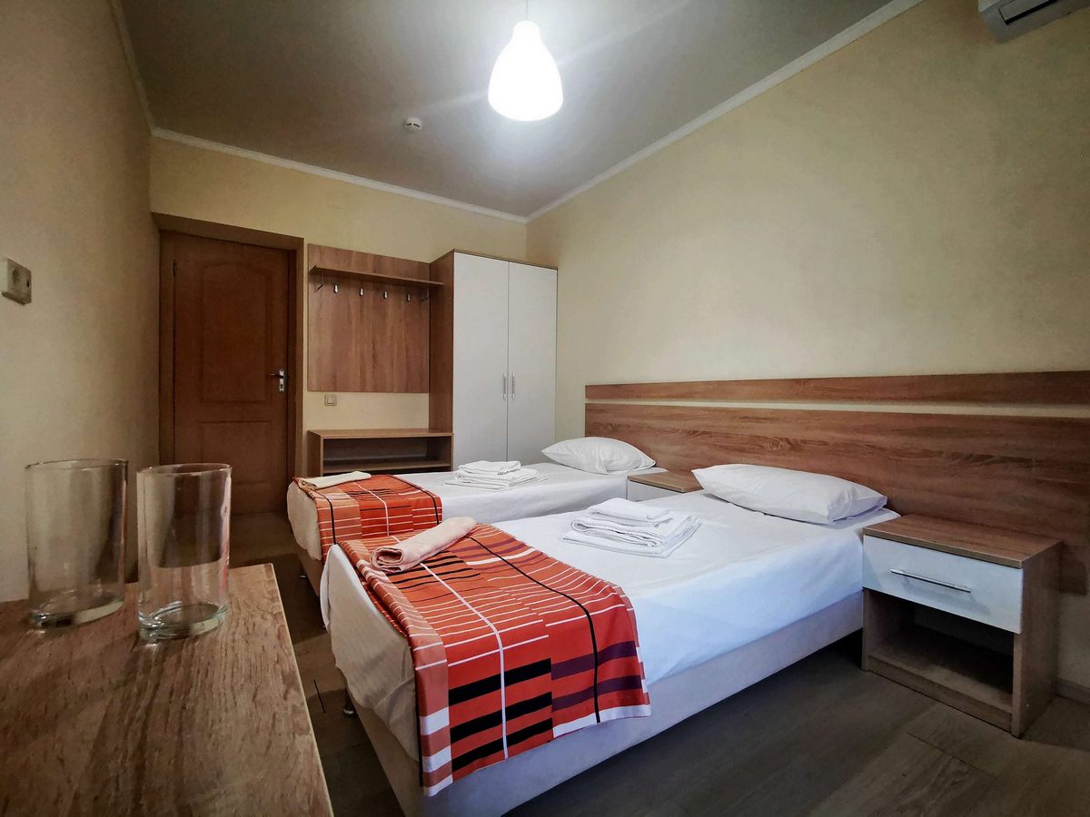В номере: две односпальные кровати или одна двуспальная, прикроватные тумбы, стол, пуф, шкаф, телевизор, холодильник, кондиционер, стаканы