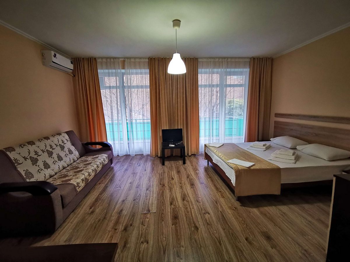 В номере: две односпальные кровати или одна двуспальная, прикроватные тумбы, стол, пуф, малогабаритный диван, шкаф, телевизор, холодильник, кондиционер, стаканы