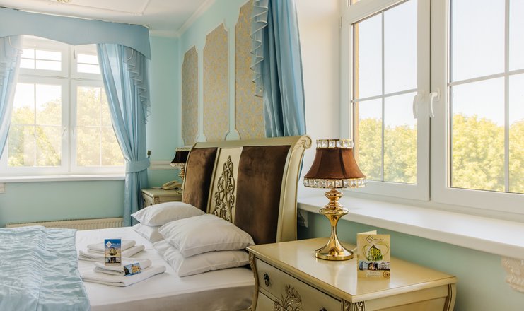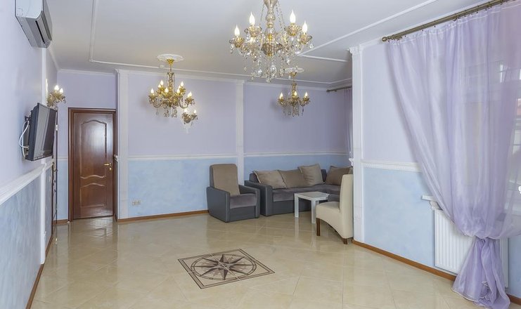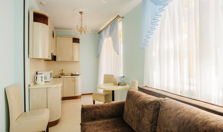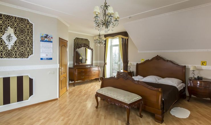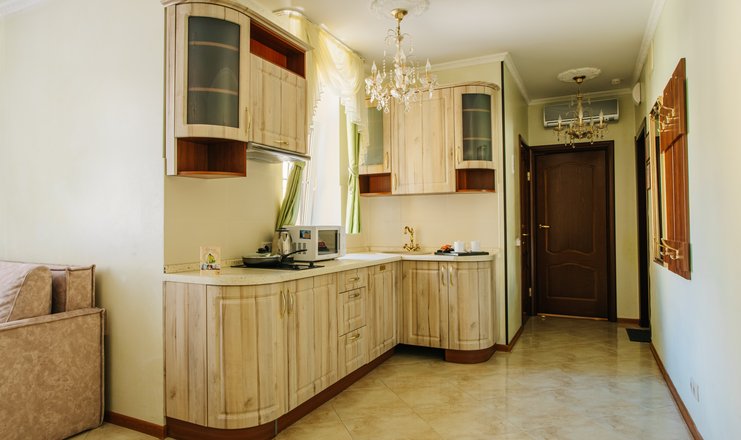 В номере: диван, зеркало, комод, кровать двуспальная, кухонная мебель, прикроватные тумбочки, стол, стулья, шкаф, гладильная доска, кондиционер, микроволновая печь, набор посуды, плита электрическая, сейф, телевизор, телефон, утюг, холодильник, чайный набор посуды, электрочайник